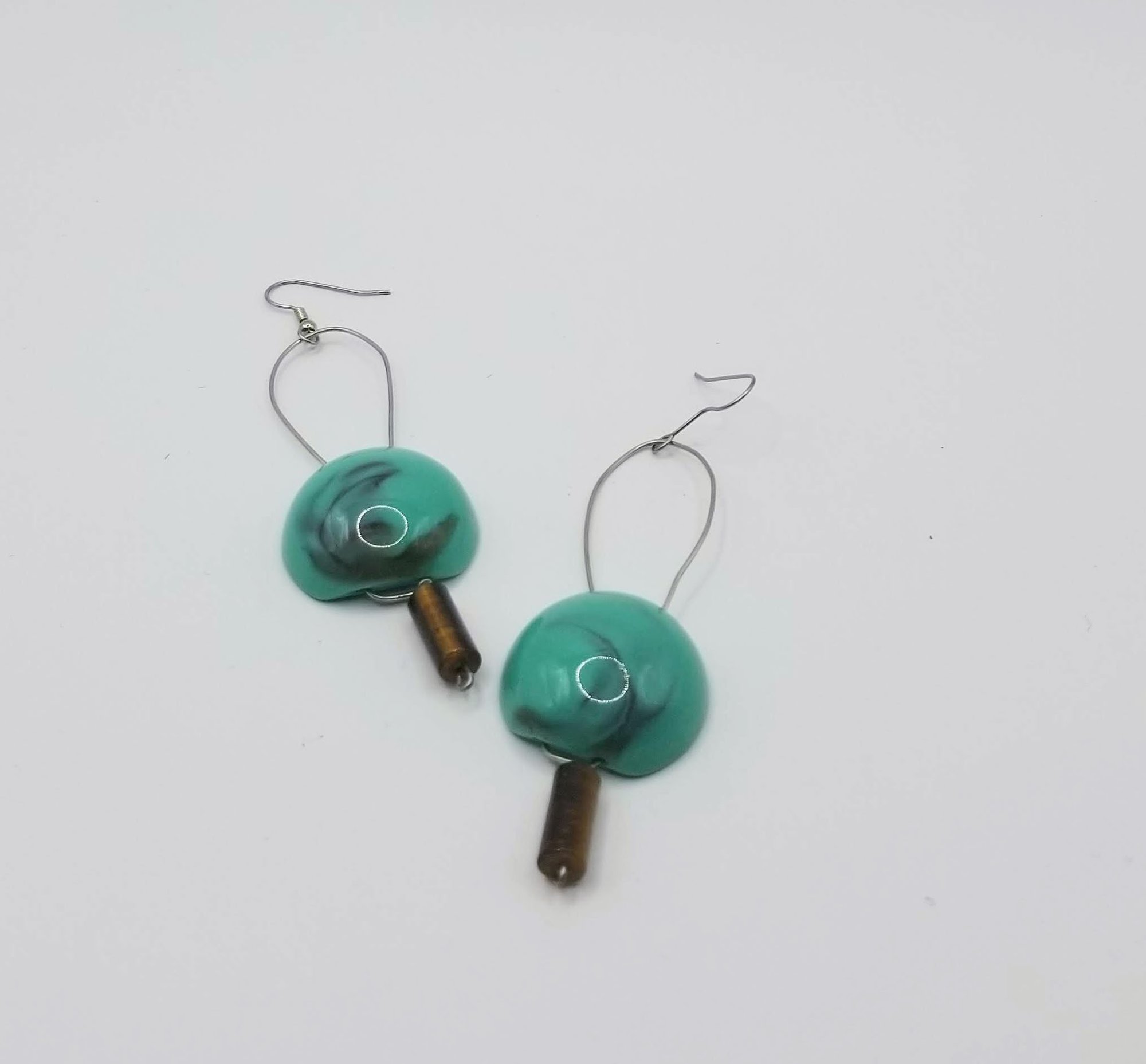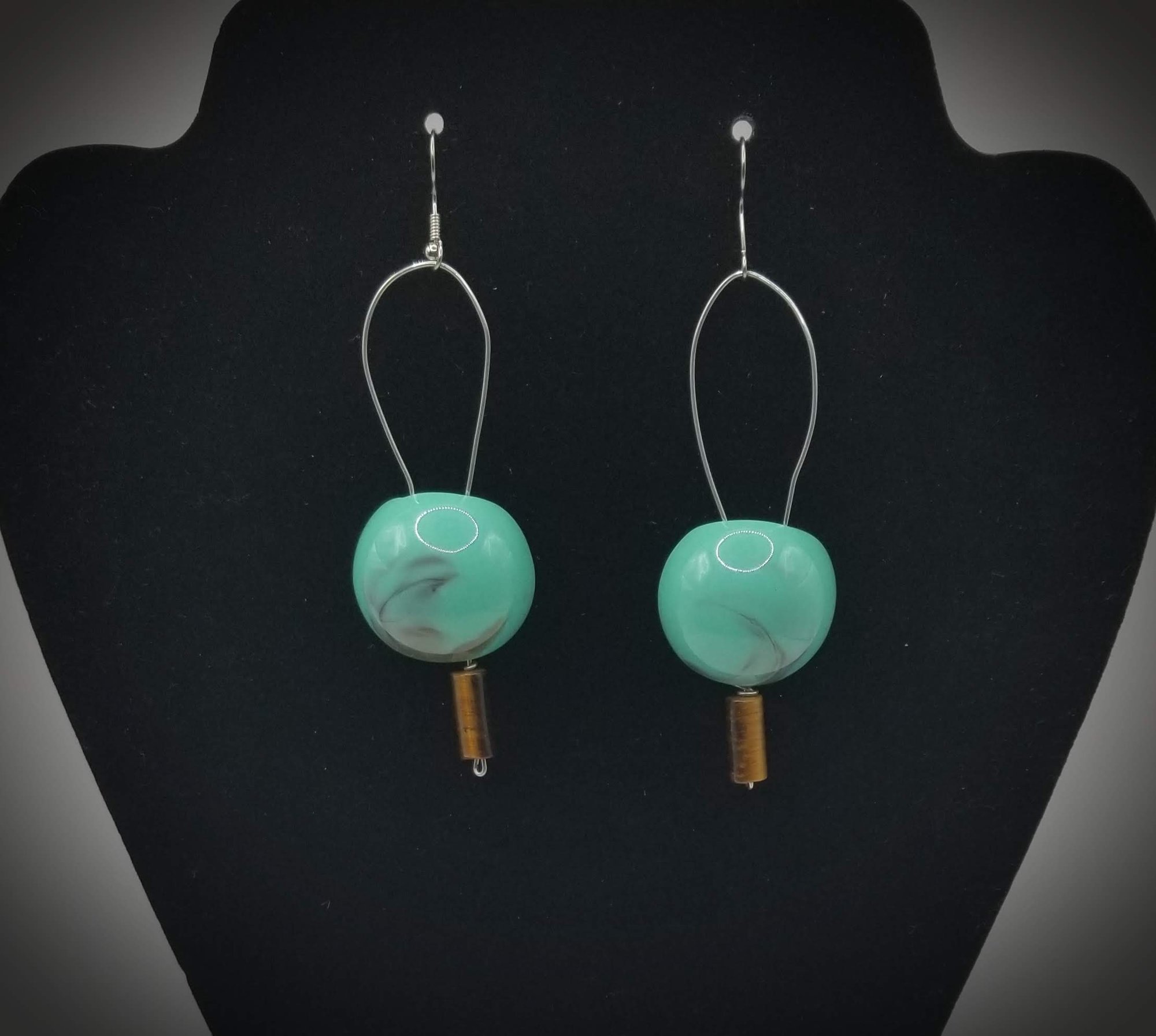 Item# 900416 - Wire shaped, open face loops with acrylic and tiger eye tube accents, SS hooks.