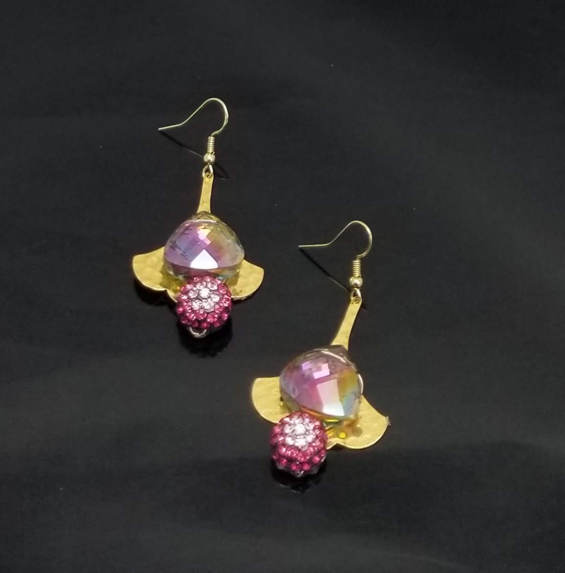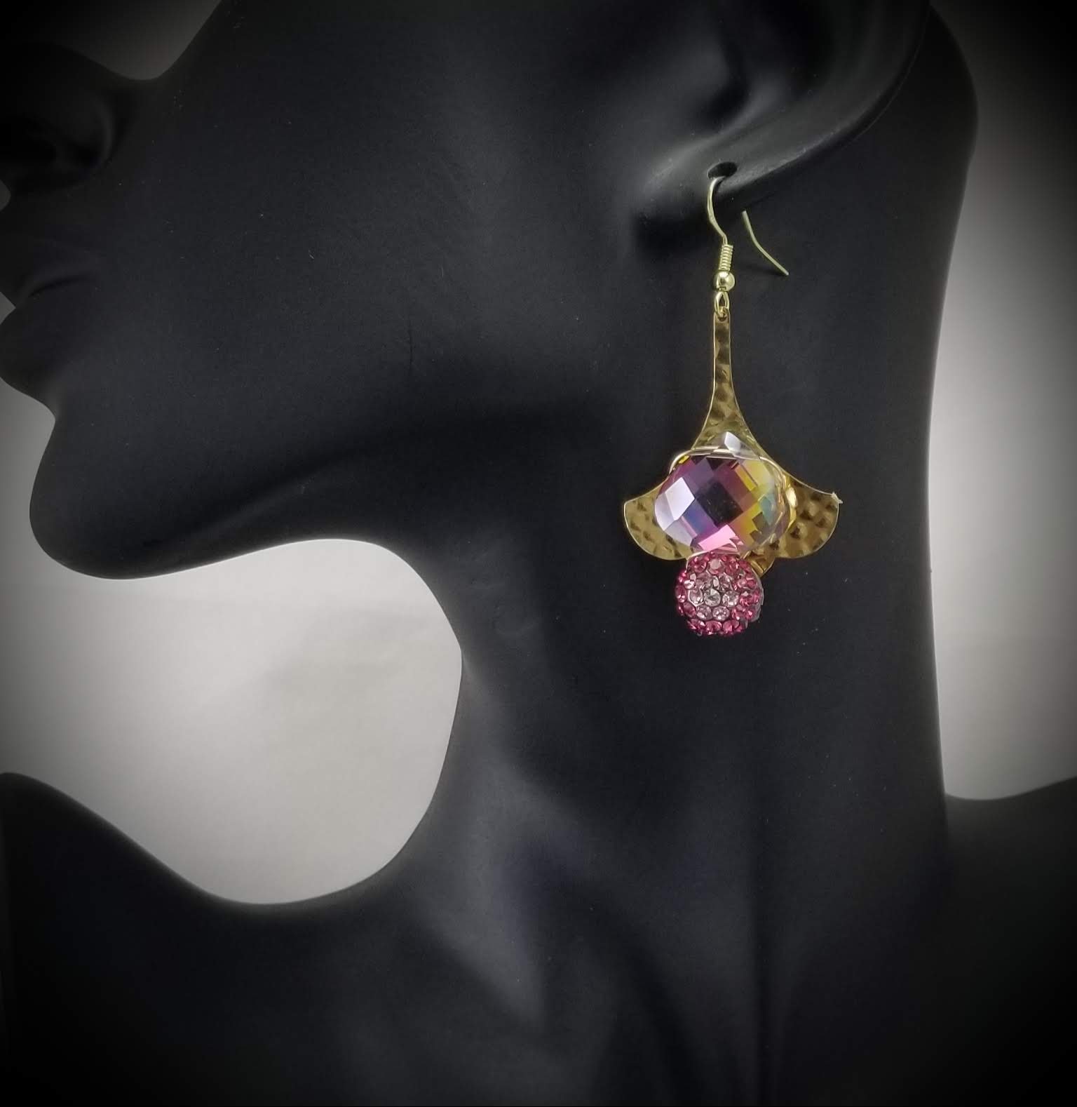 Item# 804252- 2in Faceted glass, Iridescent accents with gold hammered flat backs. Gold hooks.
