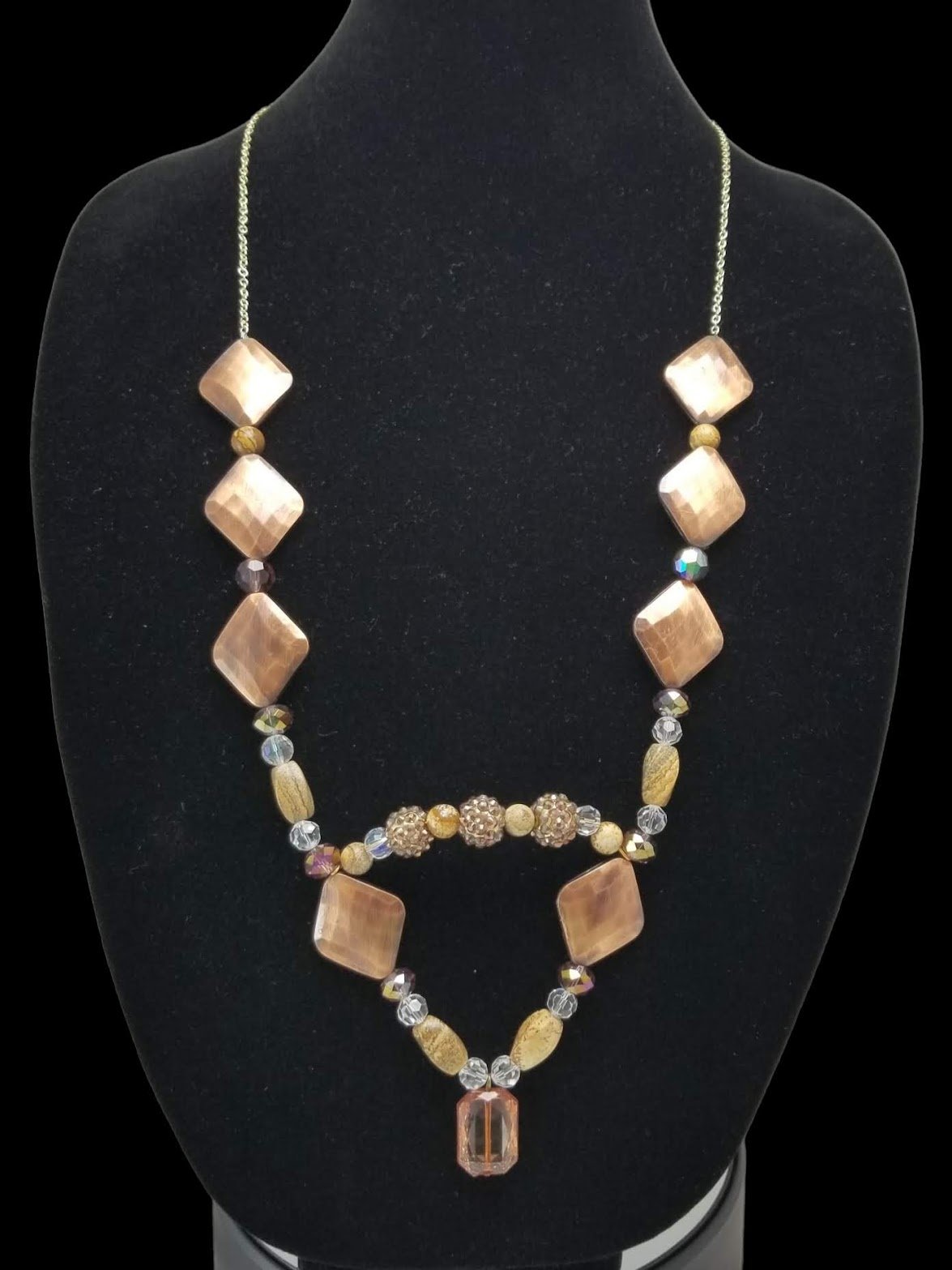 Item# 802472- Copper tone faceted flats, faceted glass paired with stone accents fillers. Beaded center connect. (Pull Over)