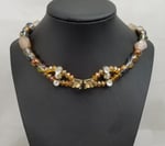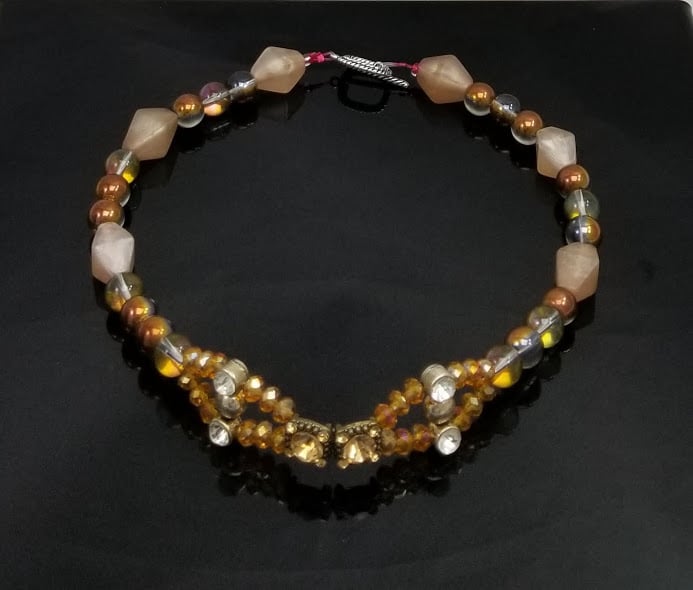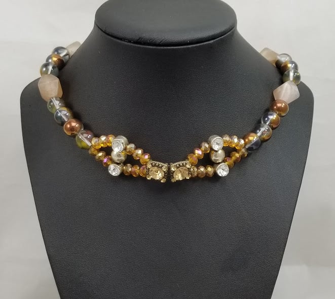 Item# 711136- 17 inch Double strand Citrine Rondella with Rhinestone metal front, surrounded by Iridescent glass and Champagne frost accents. Silver metal toggle clasp.