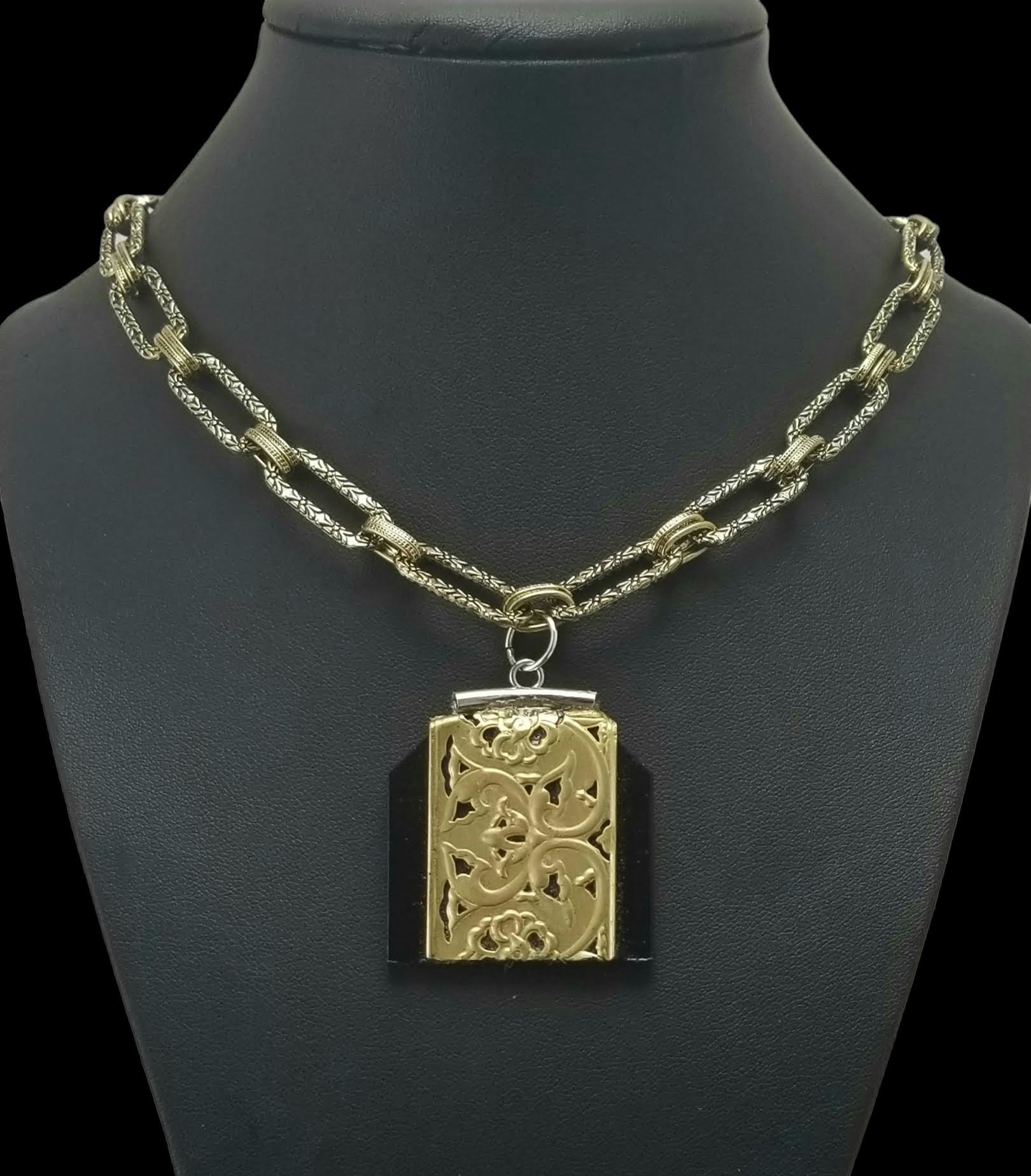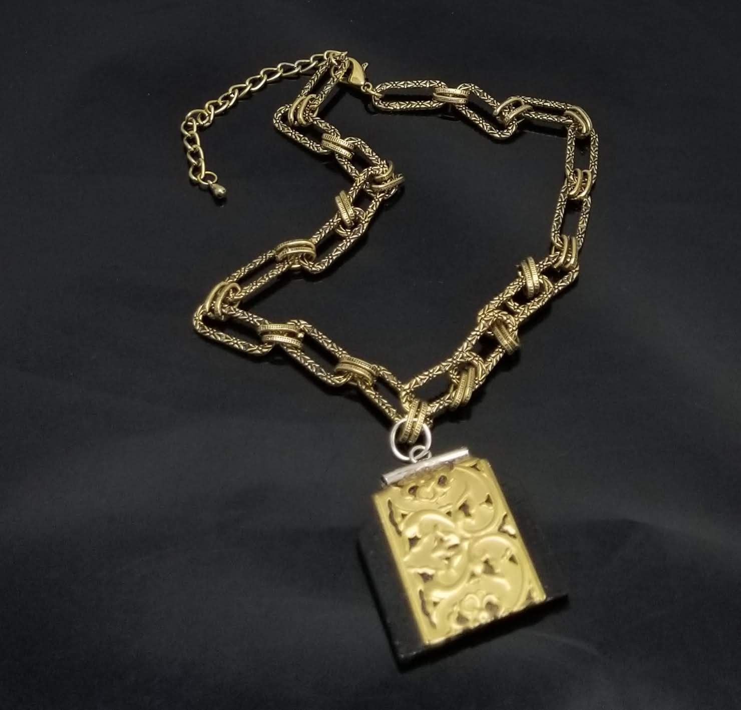 Item # 803081- Hand painted wood flat with gold aluminum, deco top layer accent. Gold metal back adjustable chain.
