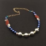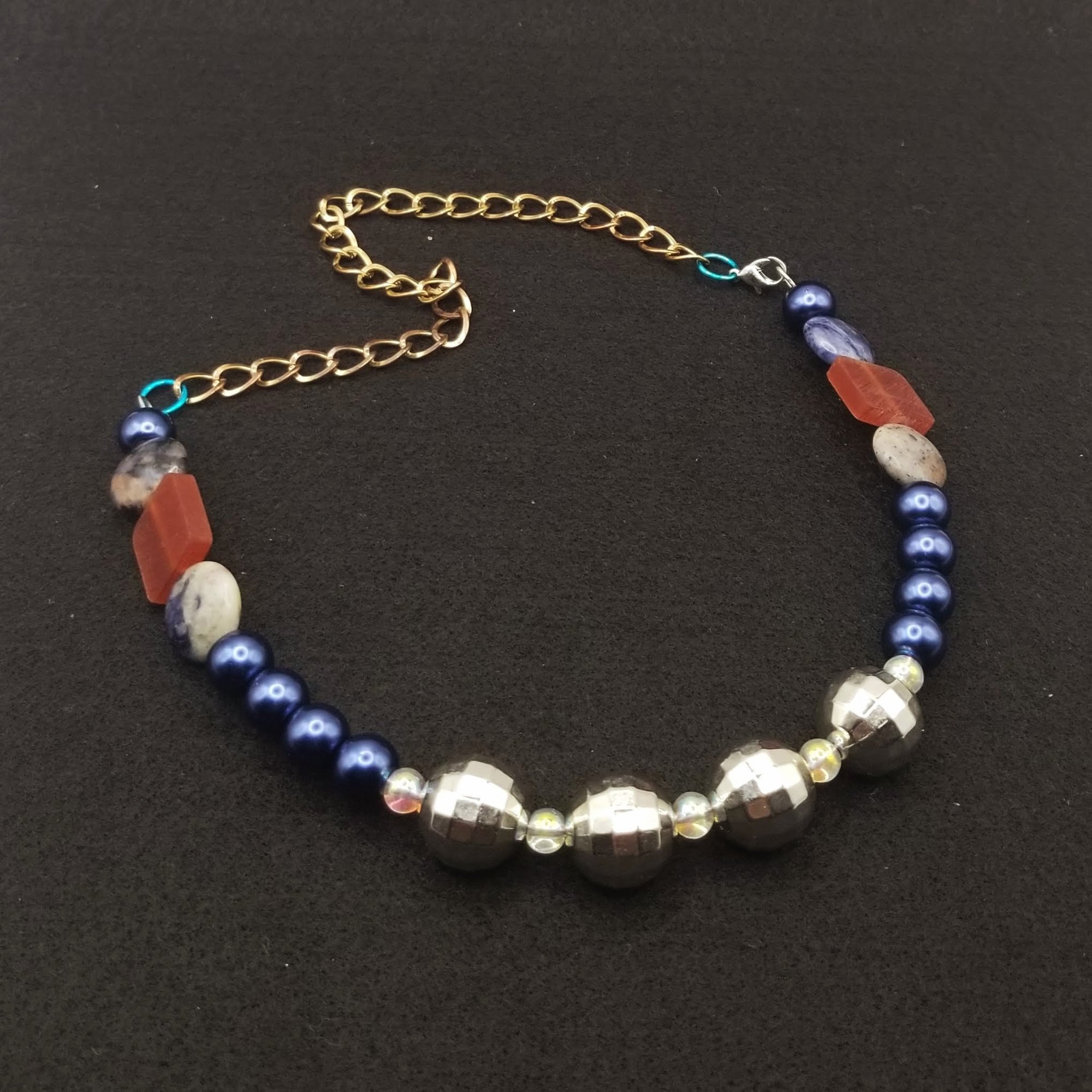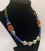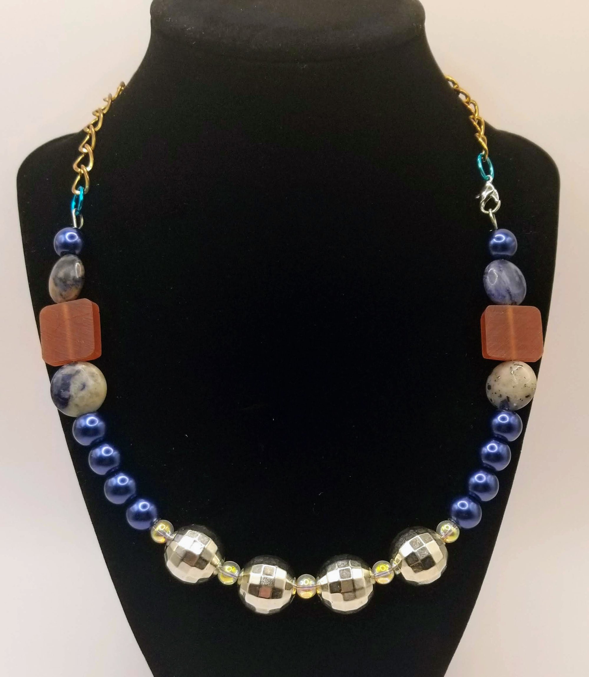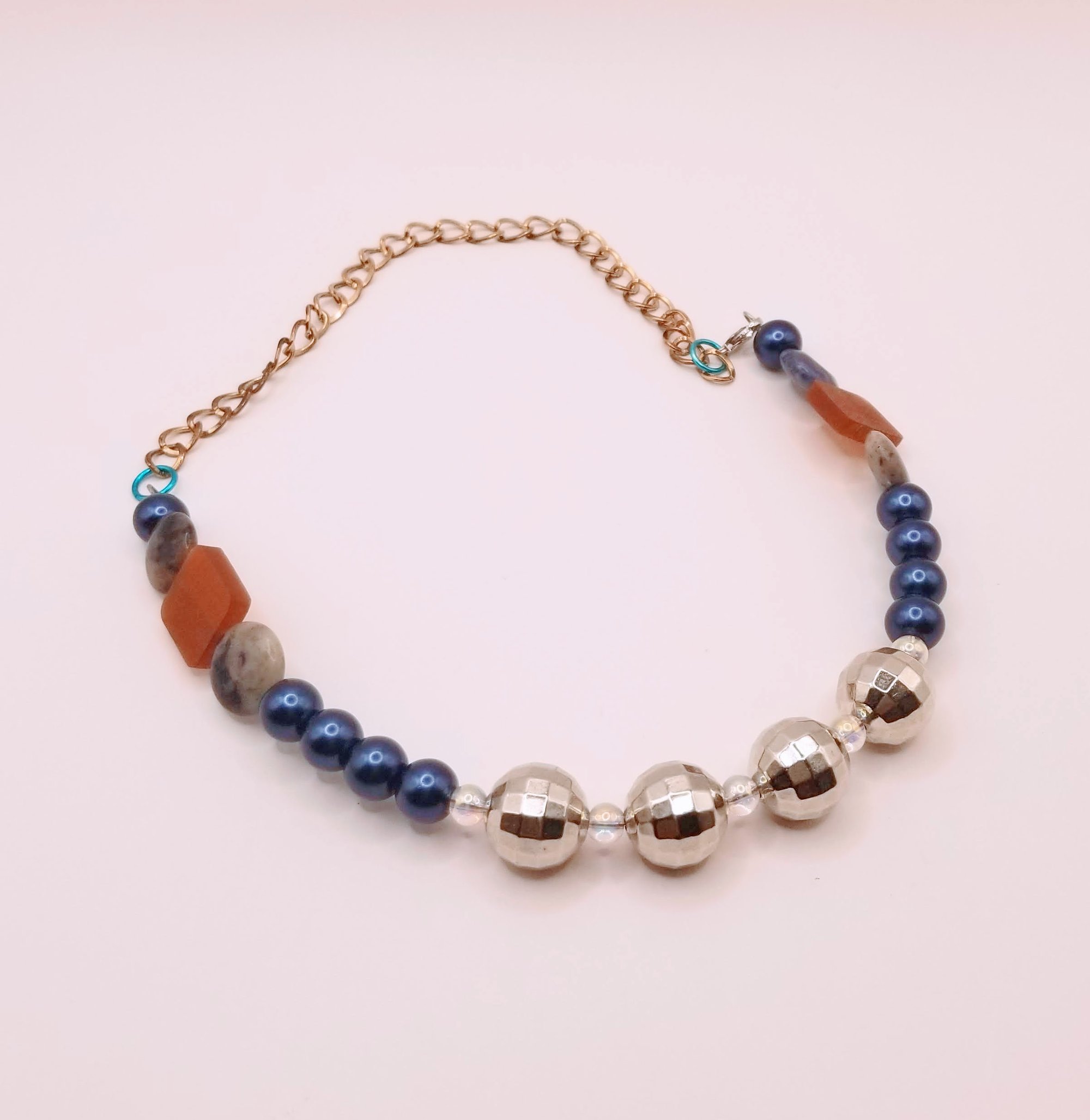 Item# 900905 - 19 inch - faceted glow ball front paired with blue gloss, stone and flat mix accents. Gold back chain with lobster claw.