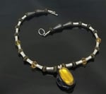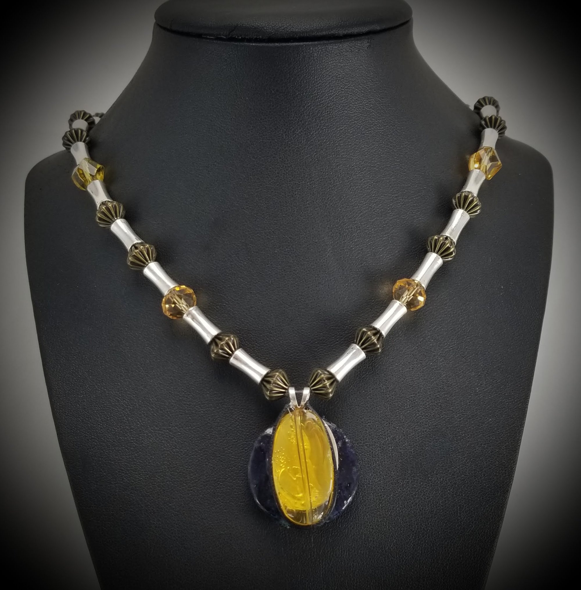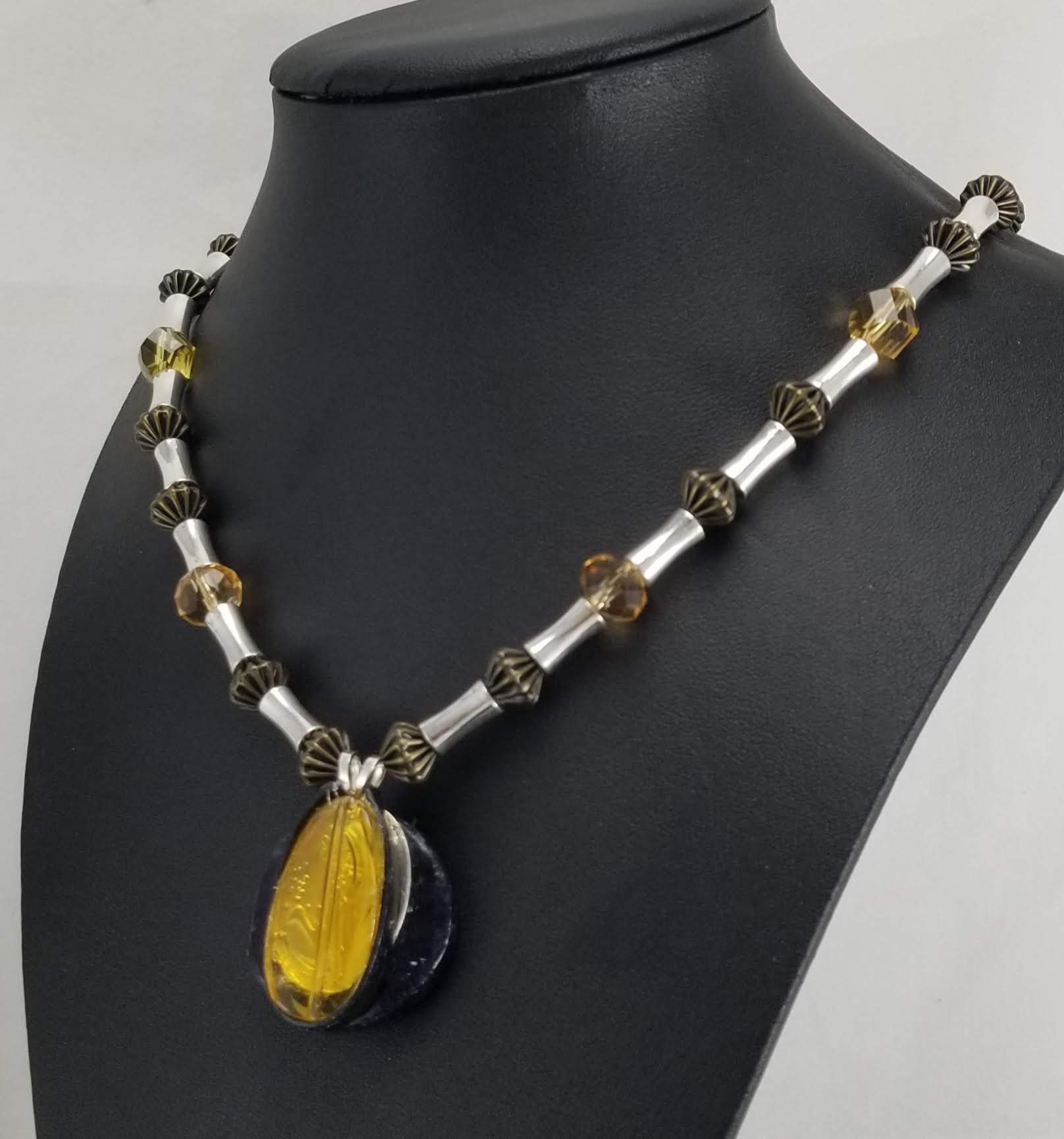 Item #801576- 18 in- Rustic metal paired with faceted glass accents. Citrine accent front drop. Silver deco toggle clasp.