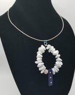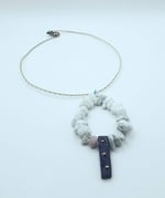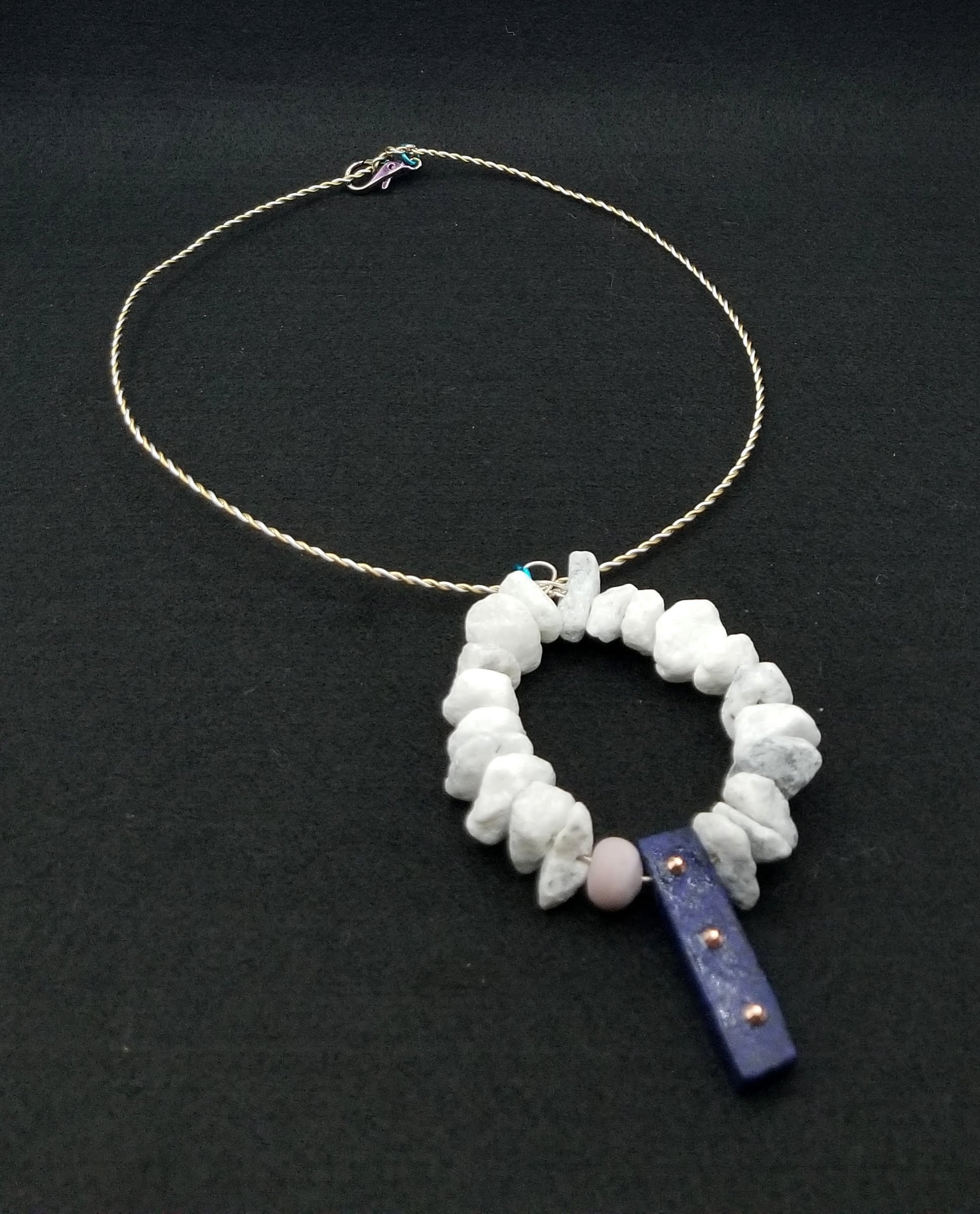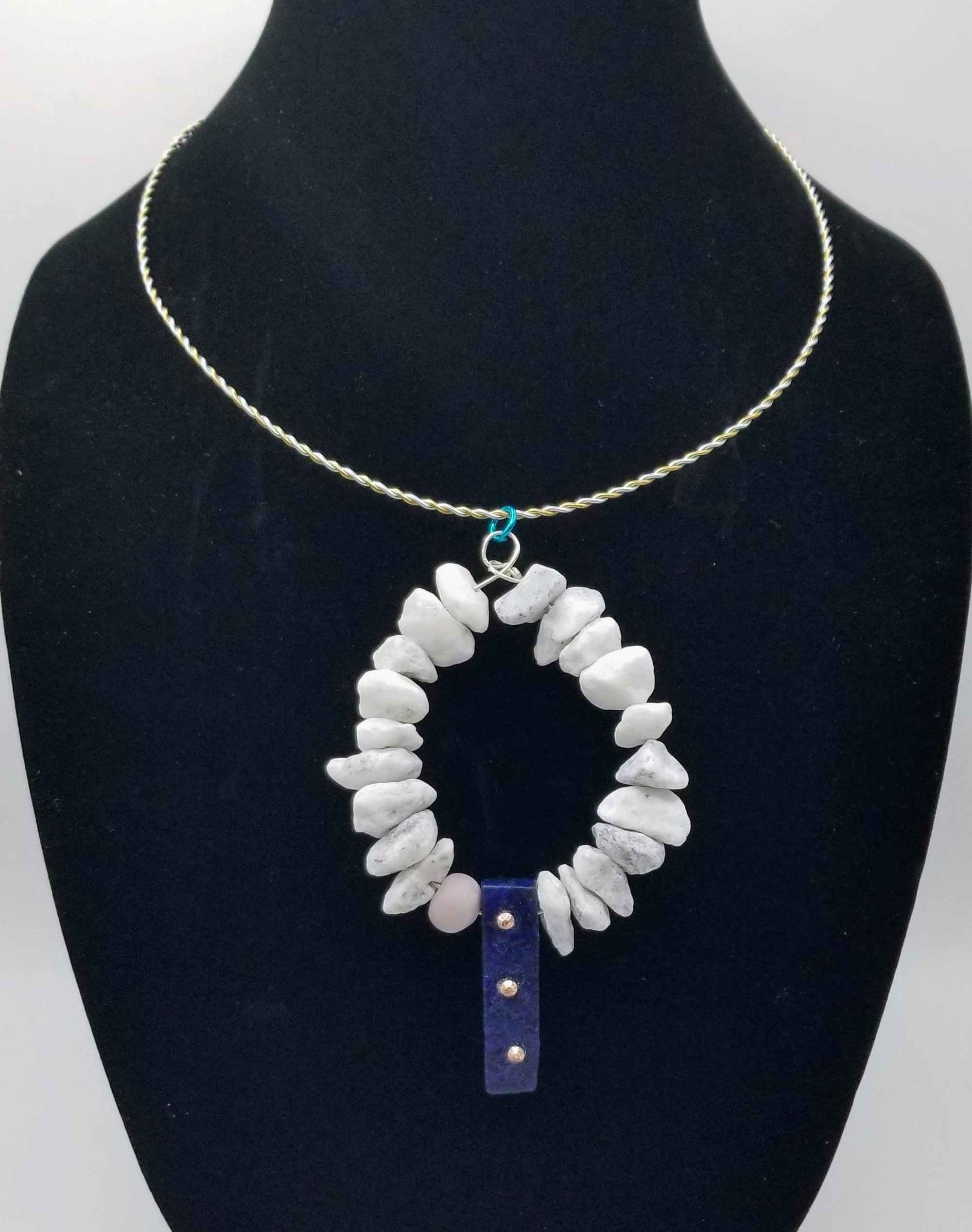 Item #900460 - Aprox 18 inch. Two tone twist flex wire, Howlite stone loop paired with stressed brushed accent front drop. Iridescent back claw.