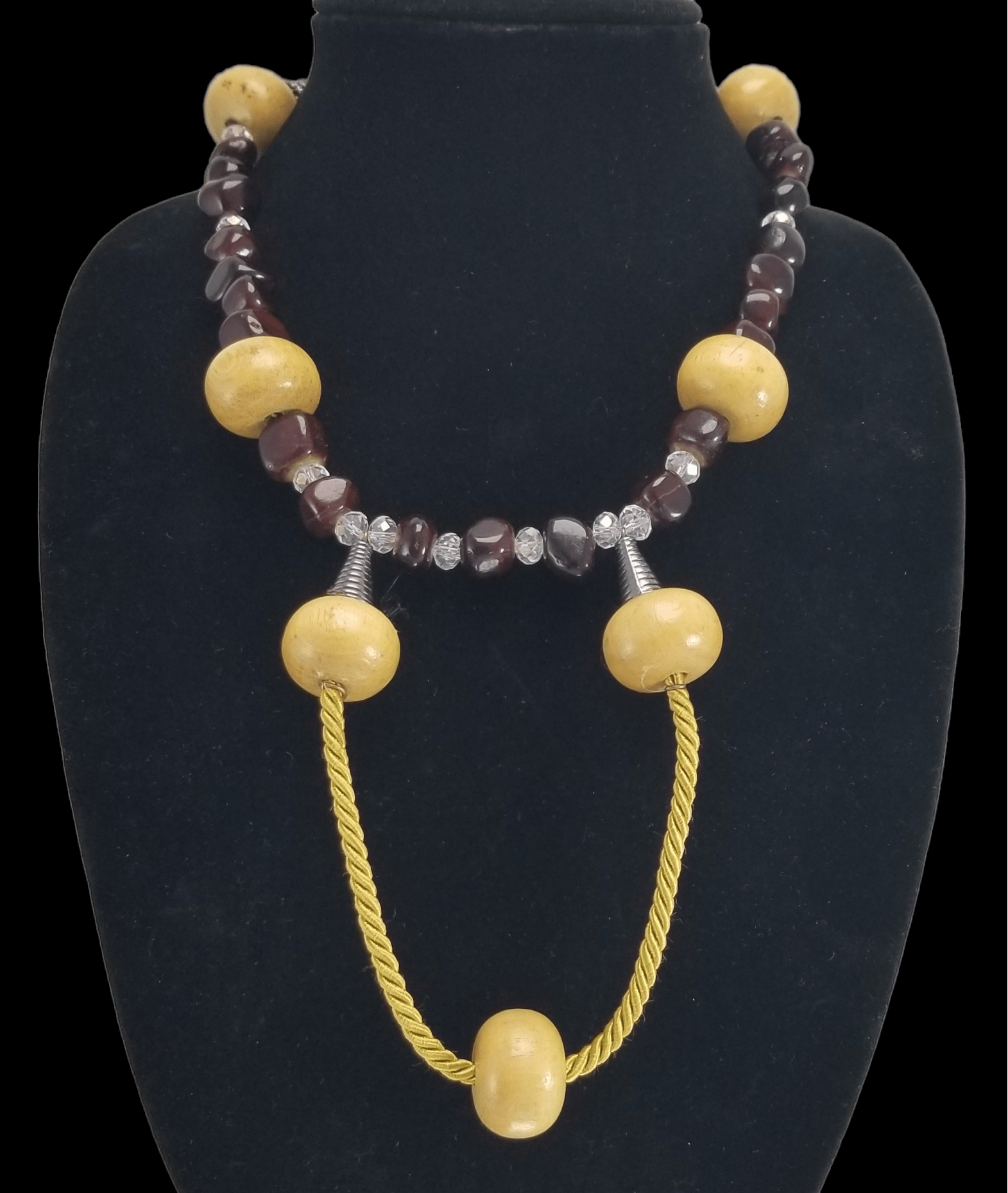 Item # 801668- 19 in 5 in drop. Wood barrels paired with glass garnet chunks and faceted glass accents. Deco back drop. Lobster claw hook.