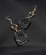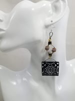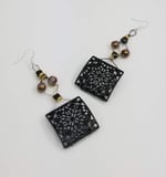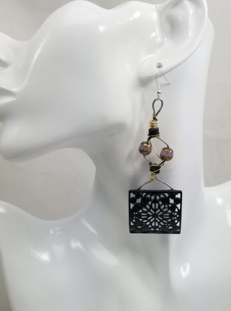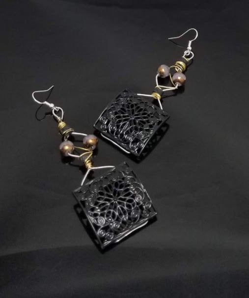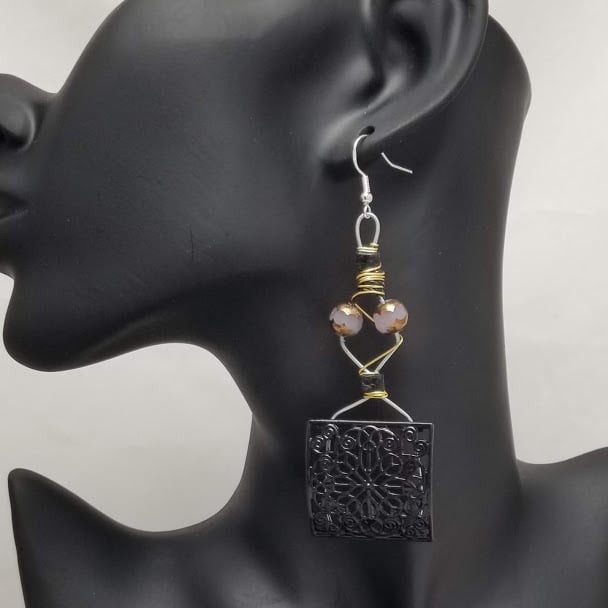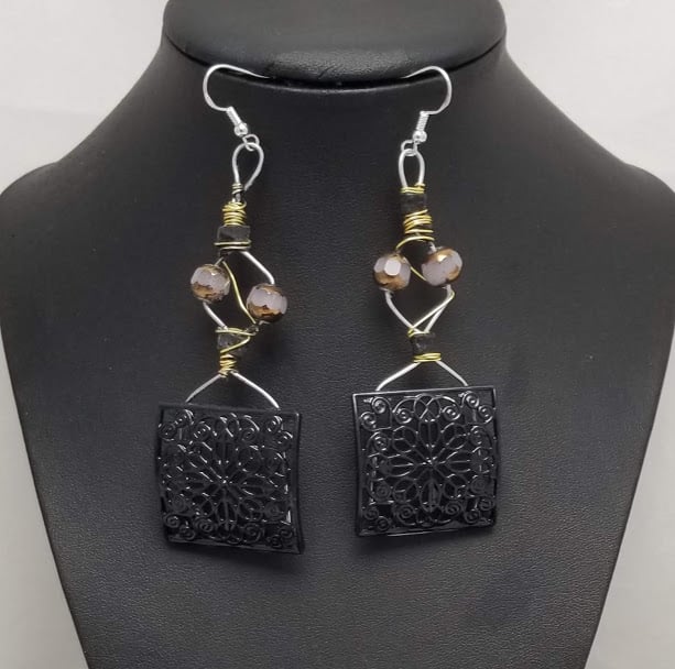 Item# 711347-3.5 inch-Jet metal drops, silver/gold wire wrap, faceted glass bead accents. Sterling Silver hooks.