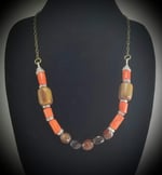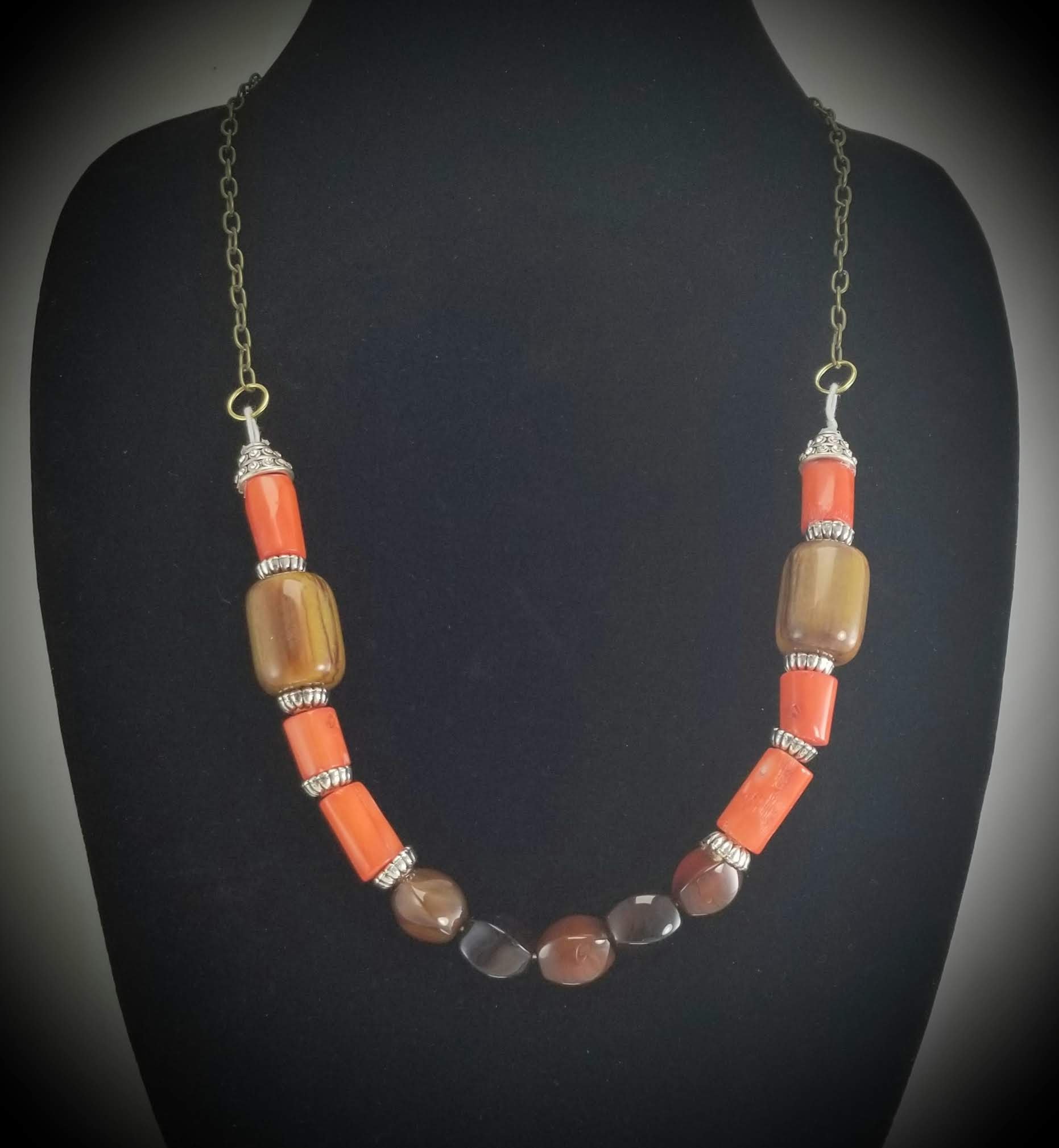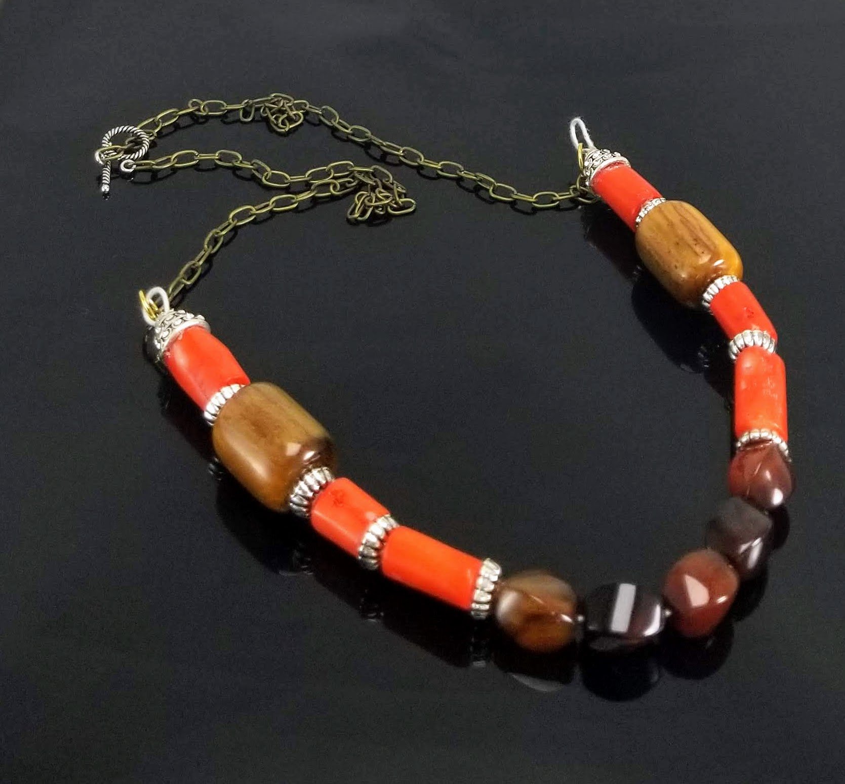 Item # 801666 - 28in Front Agate stone, Coral, Barrel and Silver accents. Rustic back chain. Silver toggle clasp.