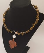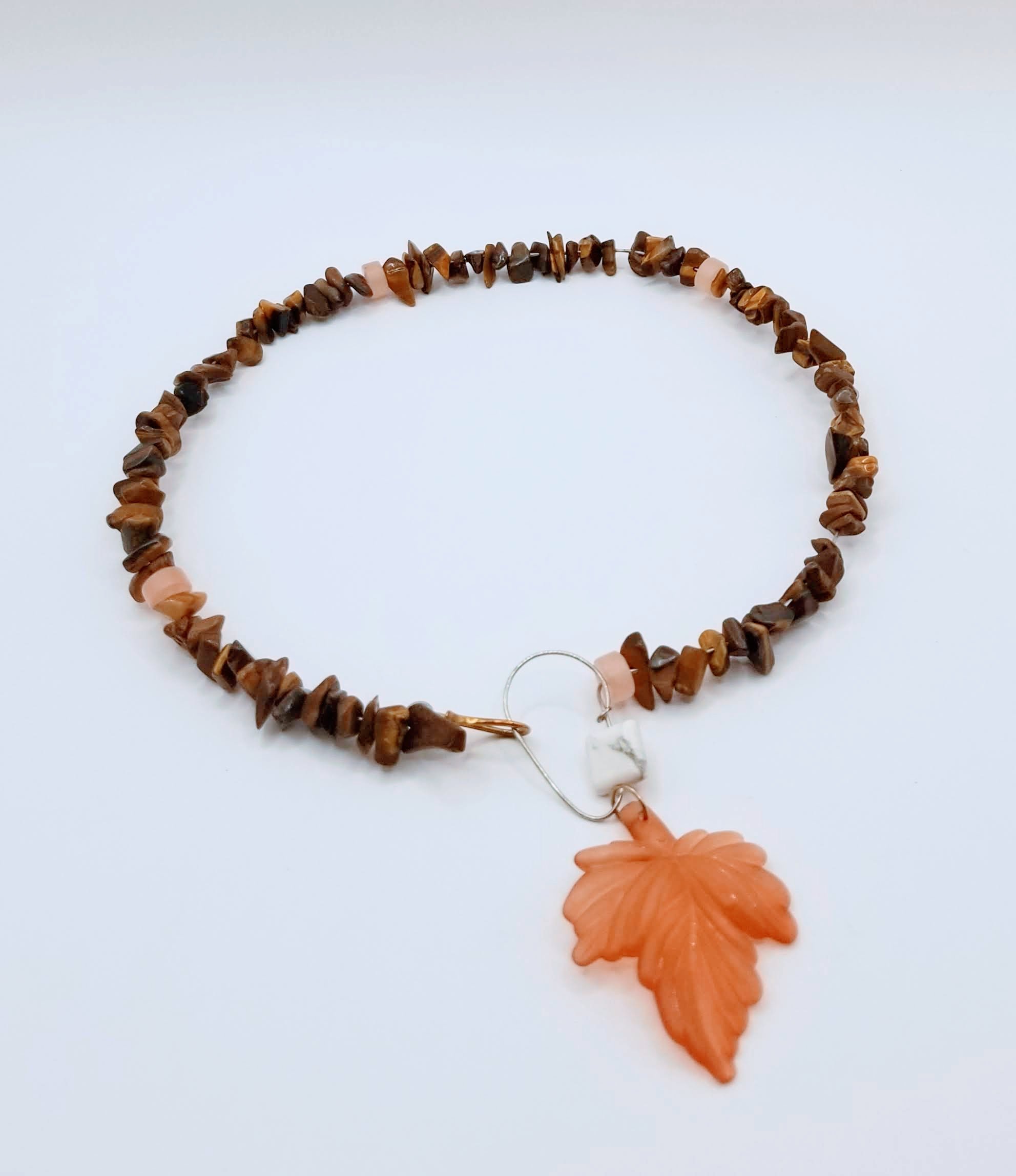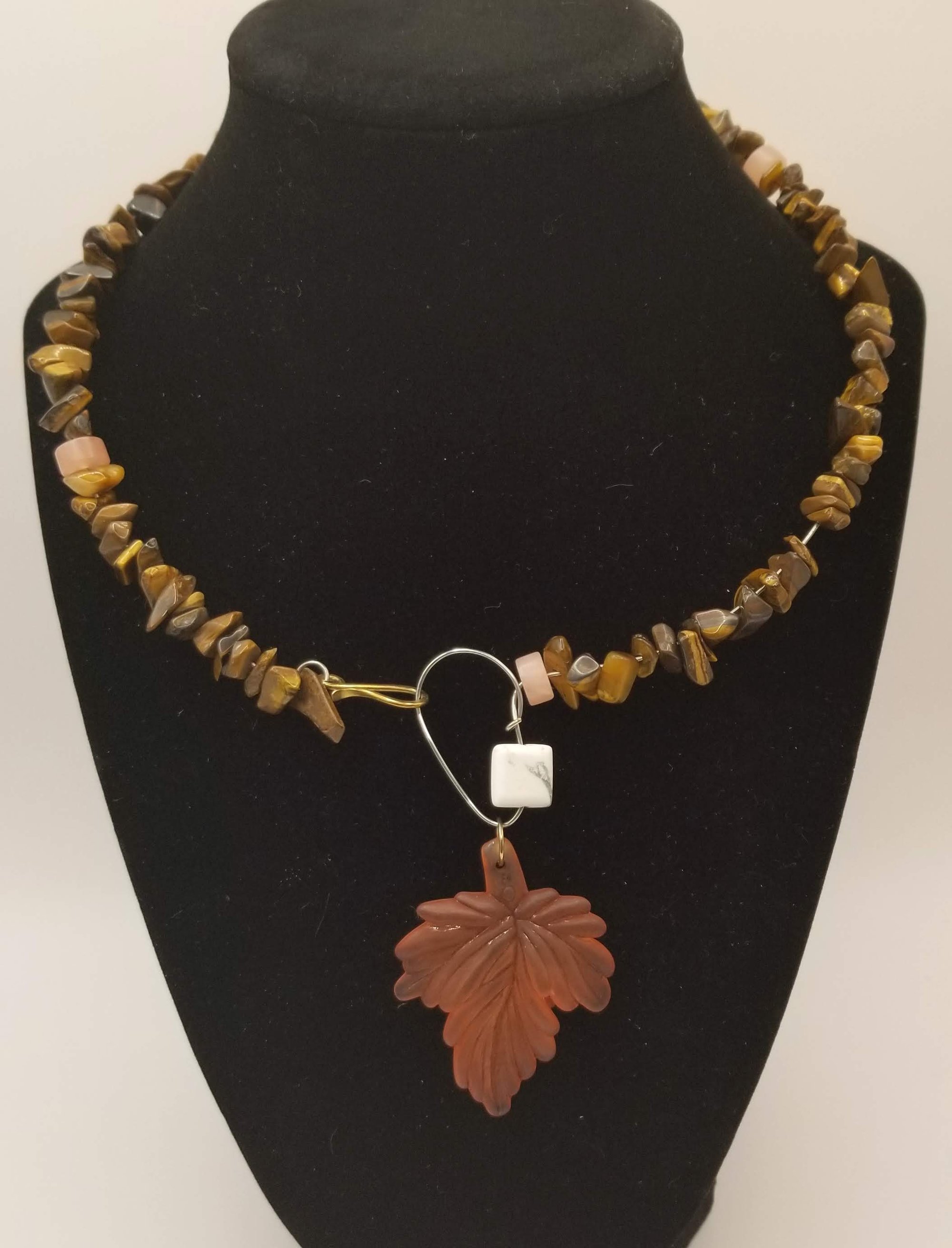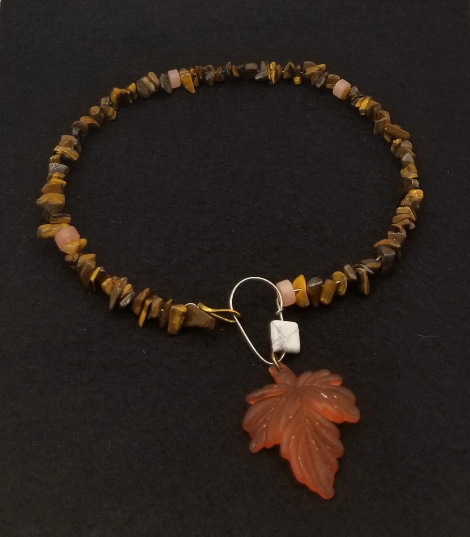 Item# 900533- Tiger eye with Pink glass acccents. Wire connect with Howlite and Frost leaf drop accent.