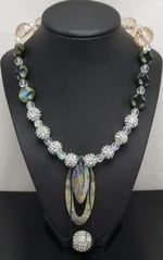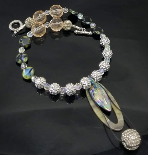 Item# 700134-18.5 inch-Crackle bead, glass filler mix, flat twirl side accents. Faceted Champagne backs. iridescent shell drop. Silver toggle clasp.