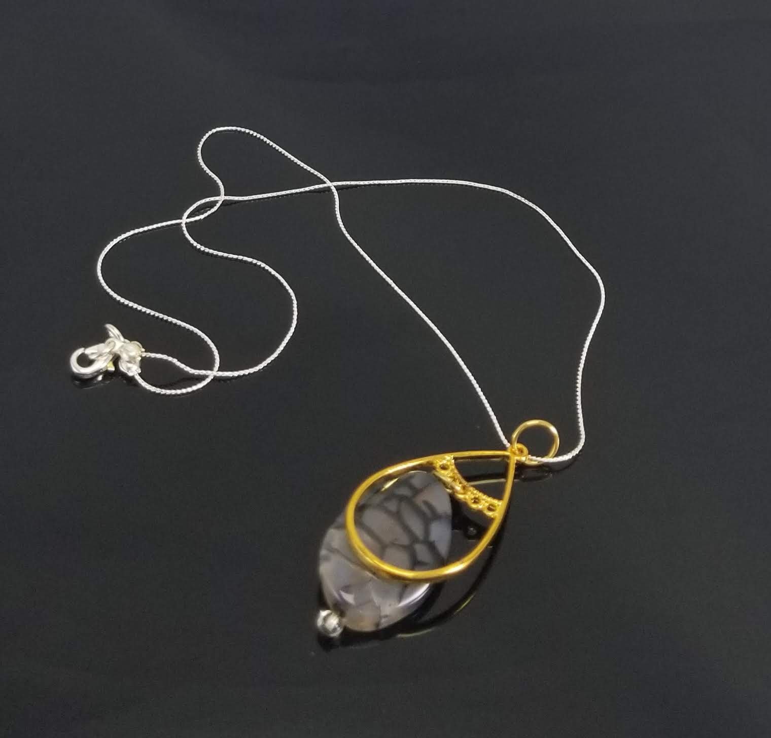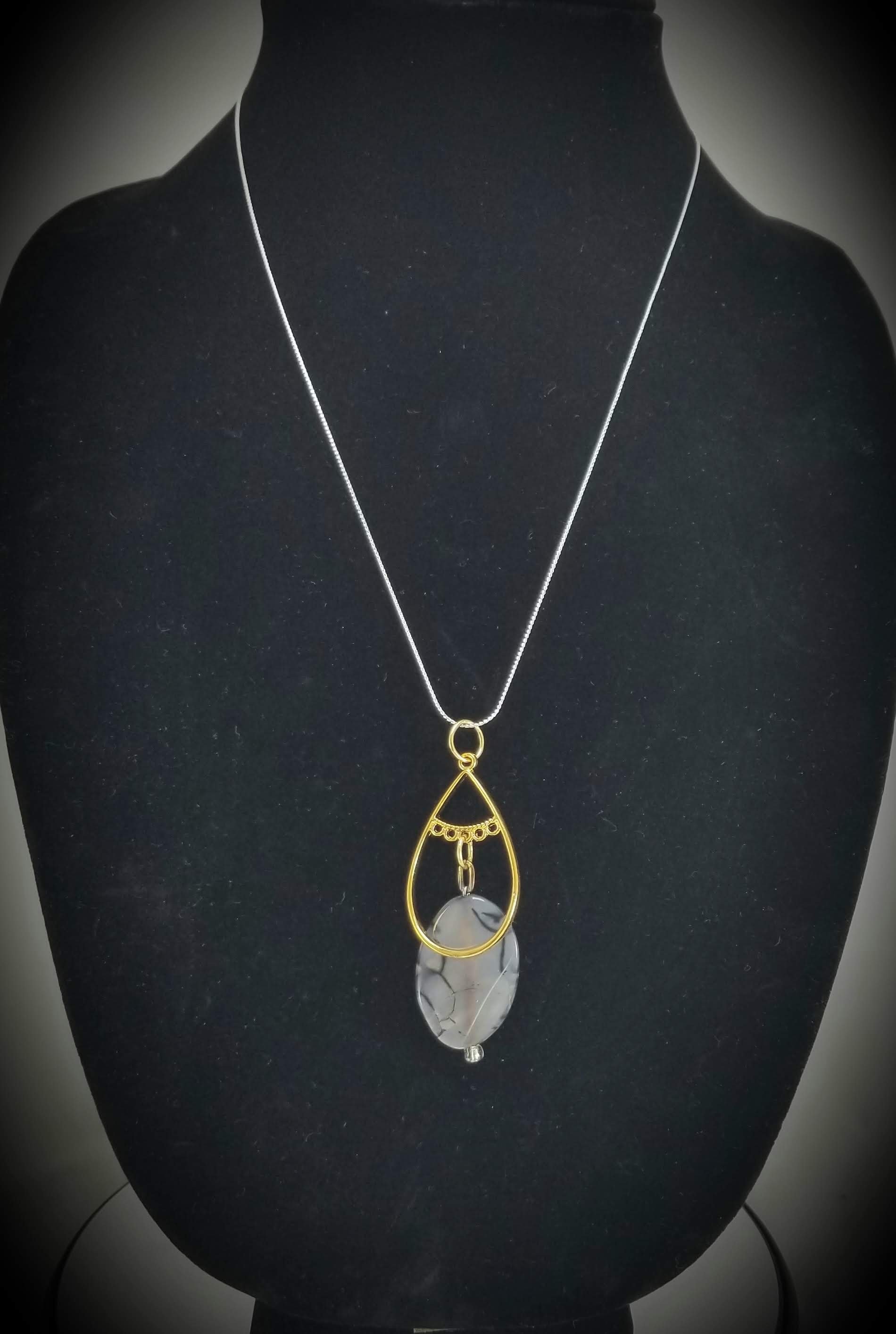 Item# 801322- 21.5 inch long, 2 inch drop. Silver fine chain paired with gold open face connect, layered over drop stone accent. Silver claw clasp.