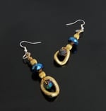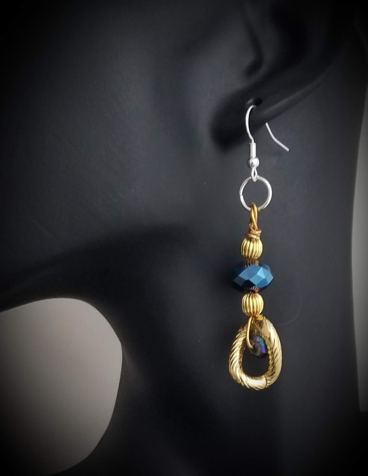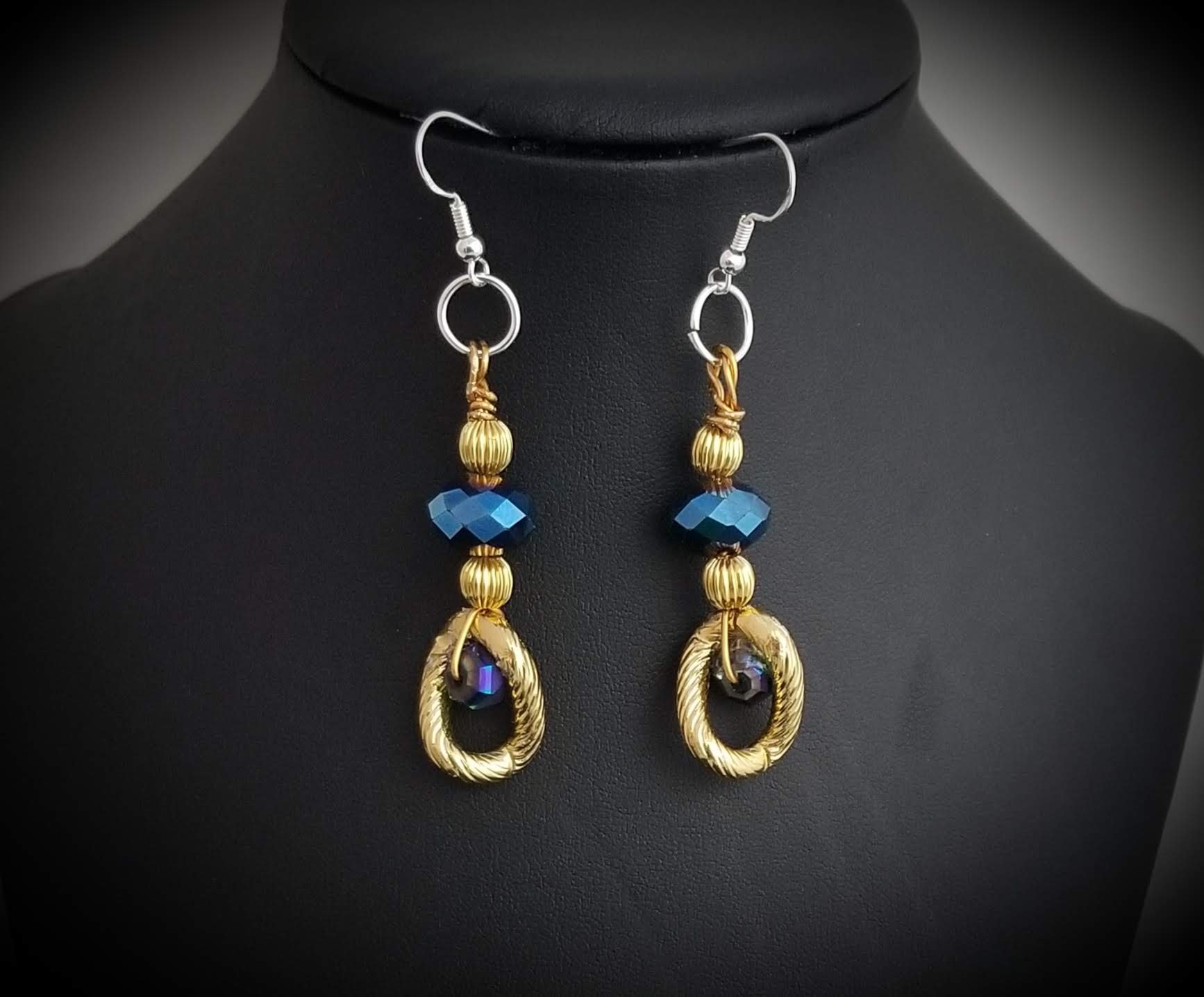 Item #801355- 2.5 in. Sapphire faceted glass intertwined with gold mix accents. Sterling Silver hooks.