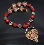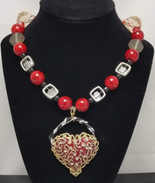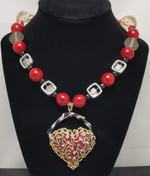 Item# 711044- 17.5 inch Red marble glass, open face silver frost metal, square glass filler, frost bead with faceted ruby glass and jumbo bead mix. Gold metal lobster claw. Aluminum connect metal 2 x 2 inch heart drop