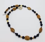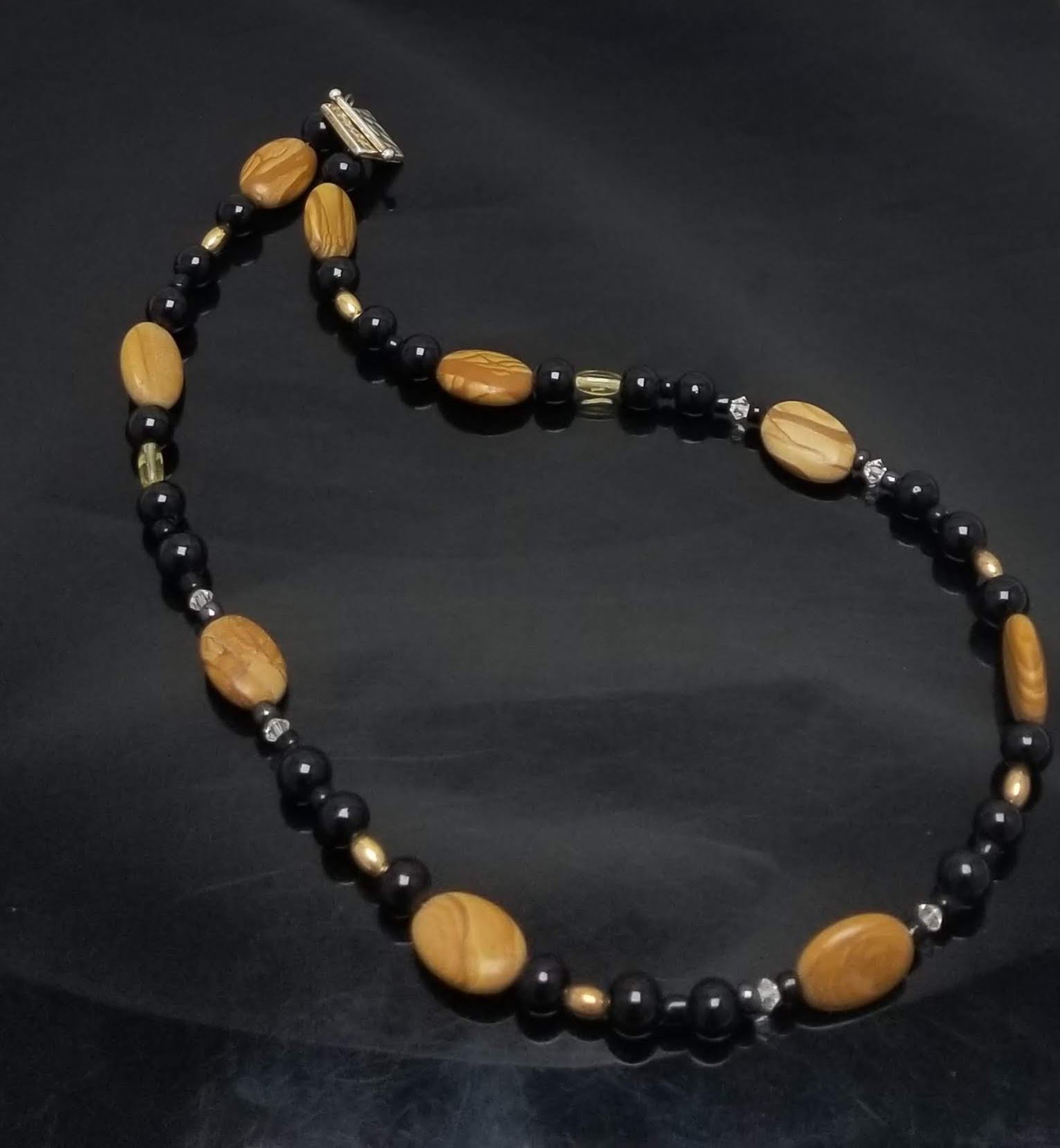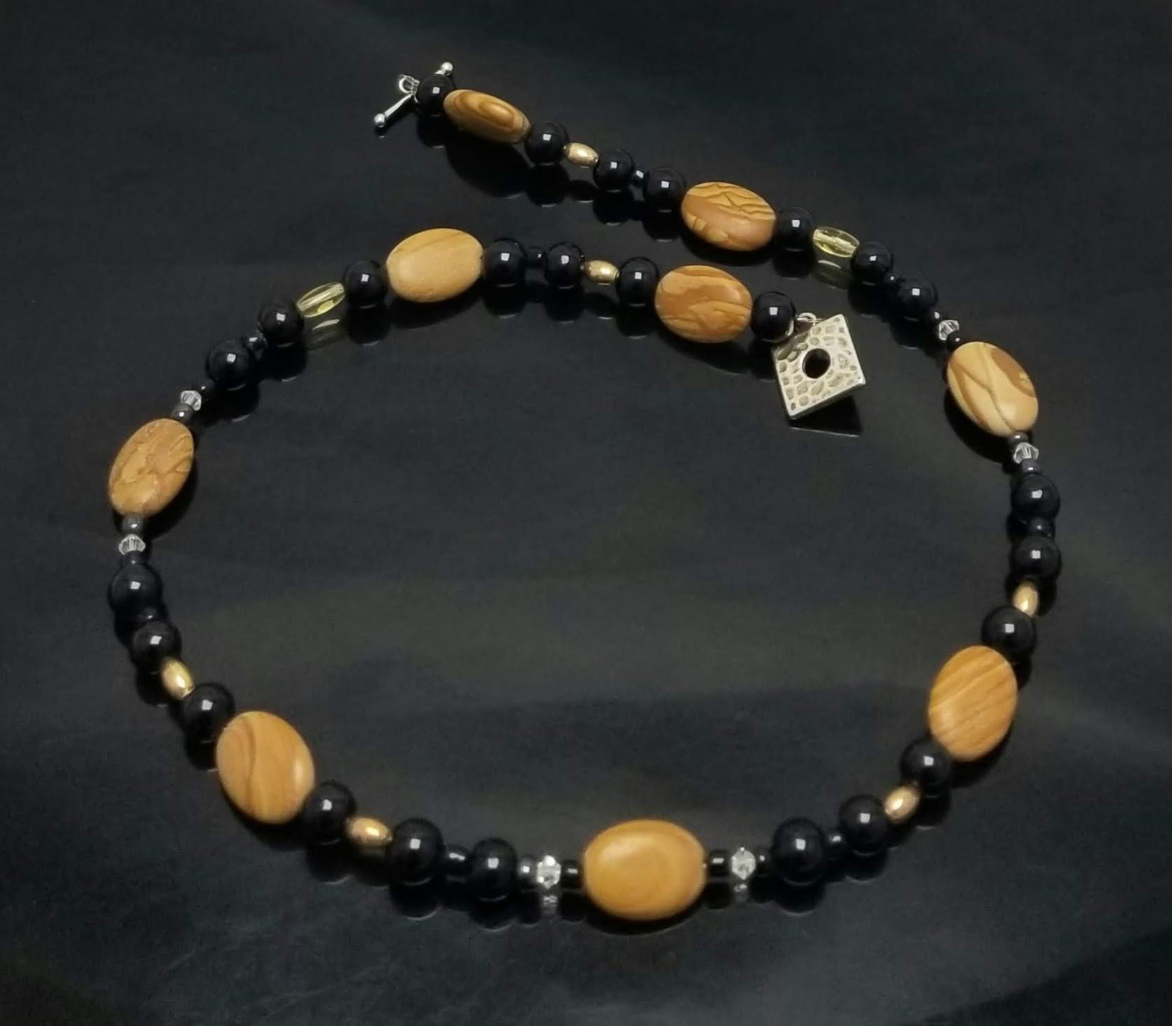 Item# 21130-20 in Wood blend flats paired with onyx bead, gold and glass fillers. Silver hammered toggle clasp.