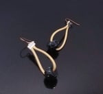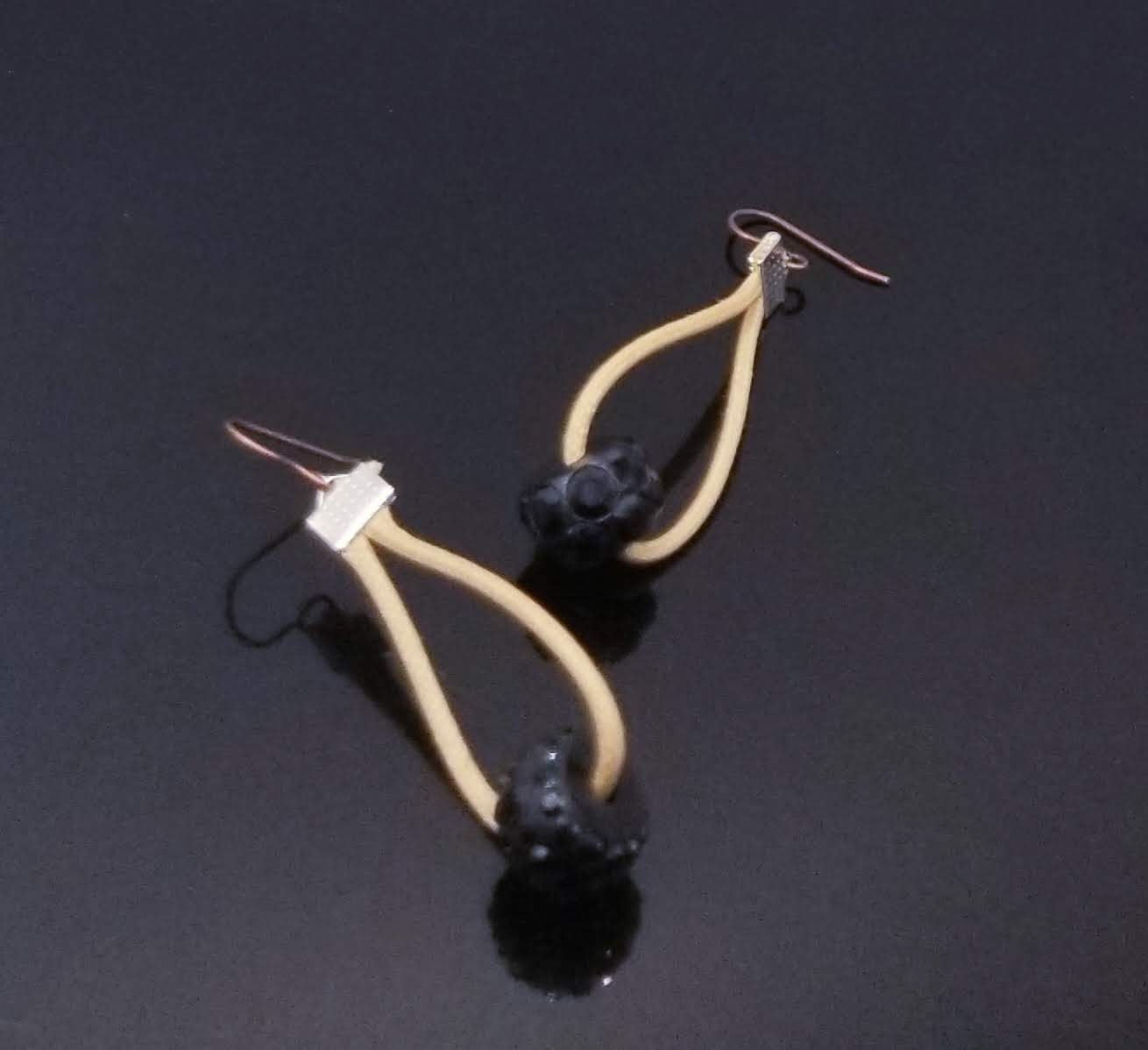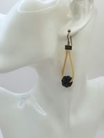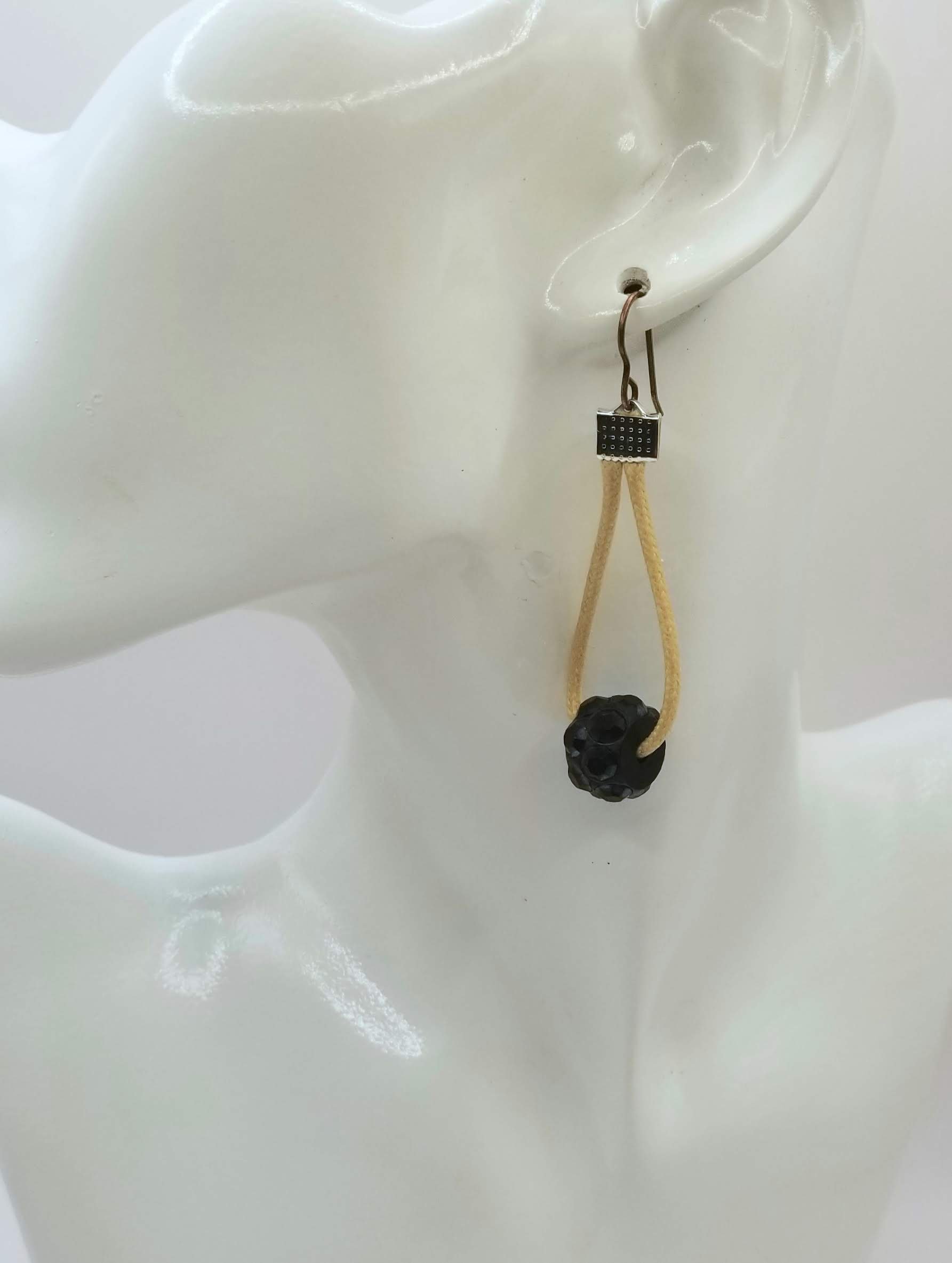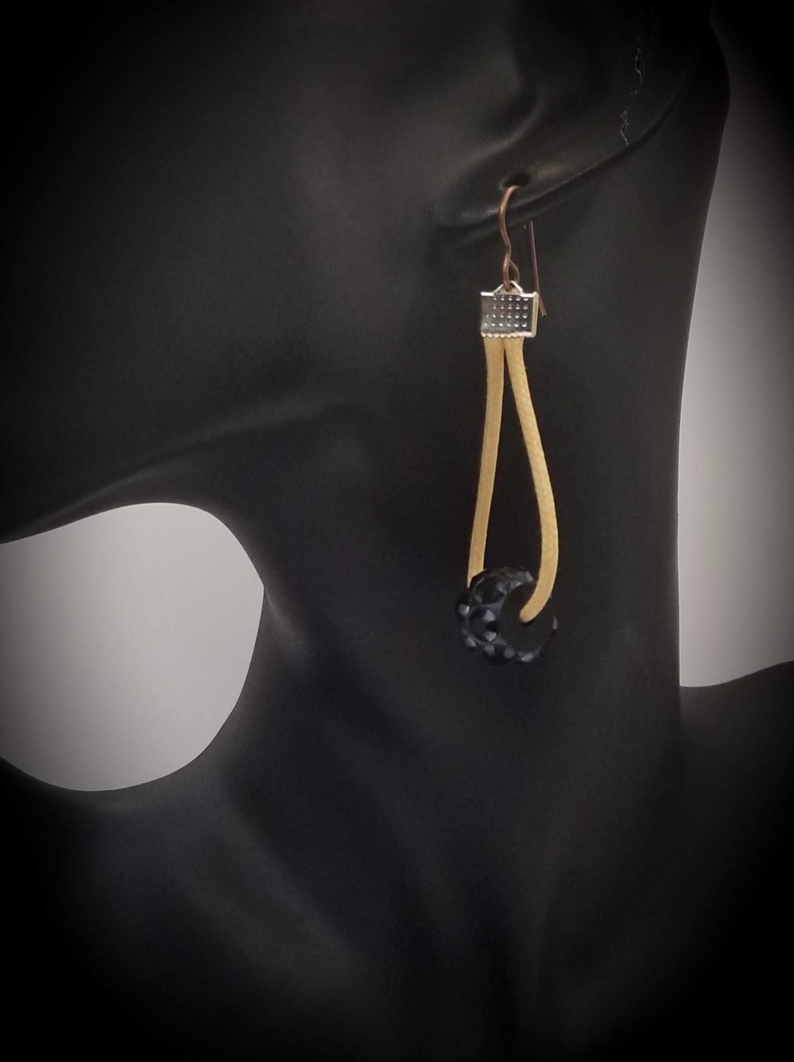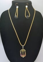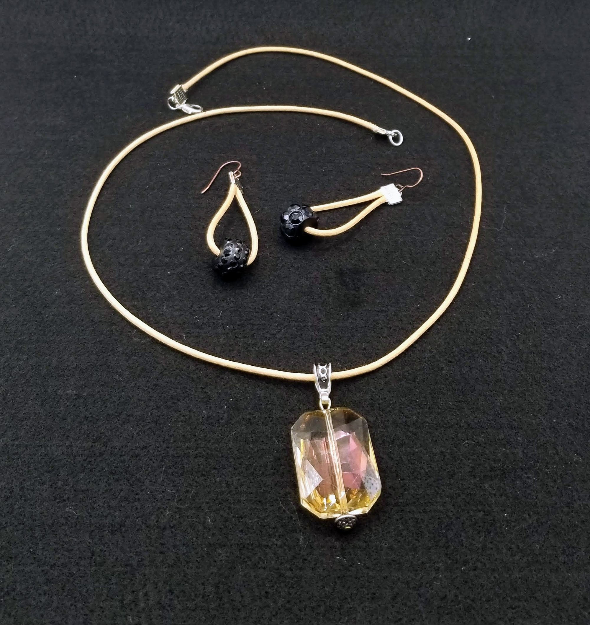 Item# 900960 - 25 inch - Neutral cording, faceted iridescent jumbo glass drop with deco metal accents. Silver lobster claw. Earrings on copper brush metal hooks.