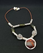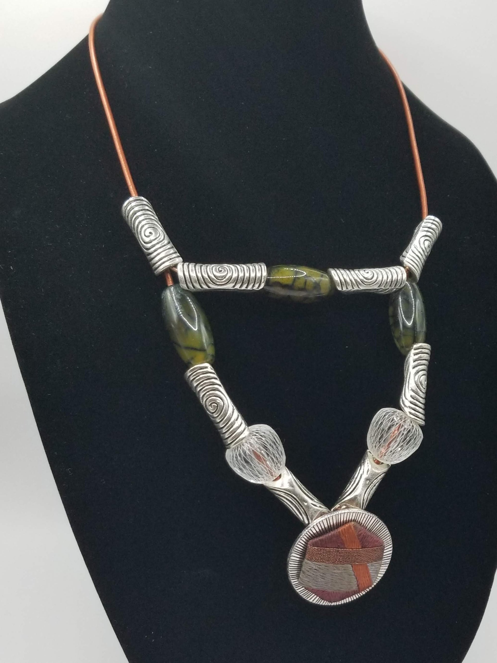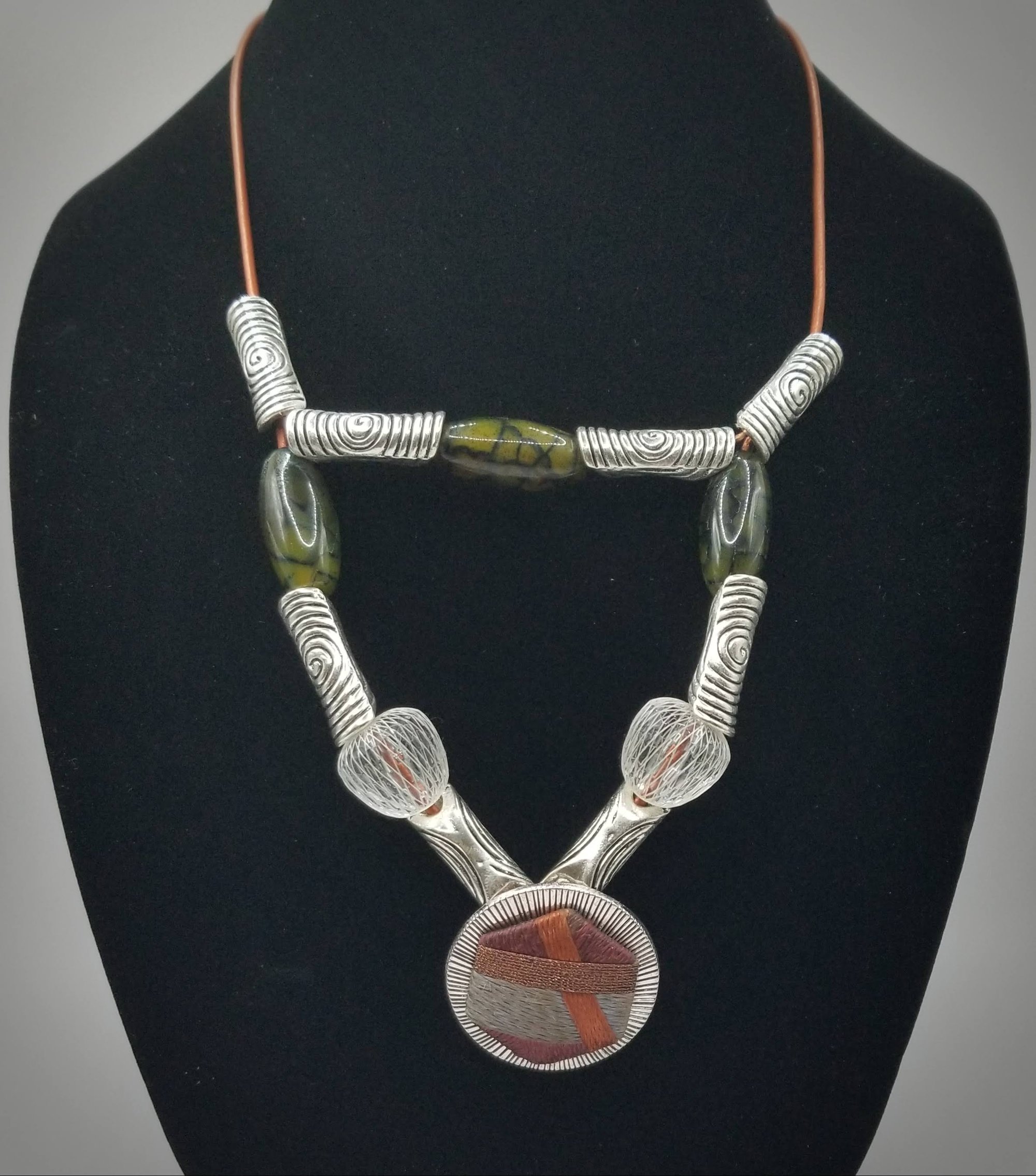 Item #900466 - 18.5 inch Deco metal with fossil pattern and glammy bead accents. Metal front fabric drop. Bronze cording with accent back. Small lobster claw hook.