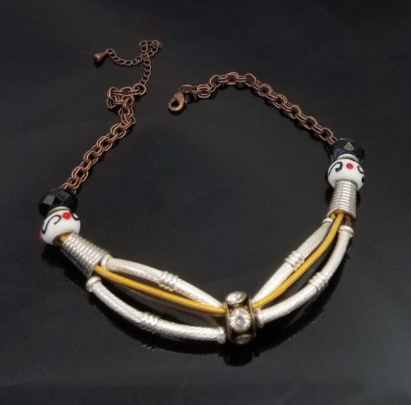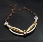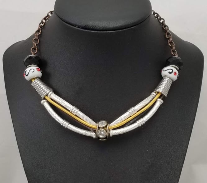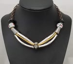 Item# 711131 - 14 inch Neck Hugger - Silver metal connects with Gold/Brown leather blend. Center front Stone, Deco bead side accents. Rustic Copper metal back chain.