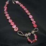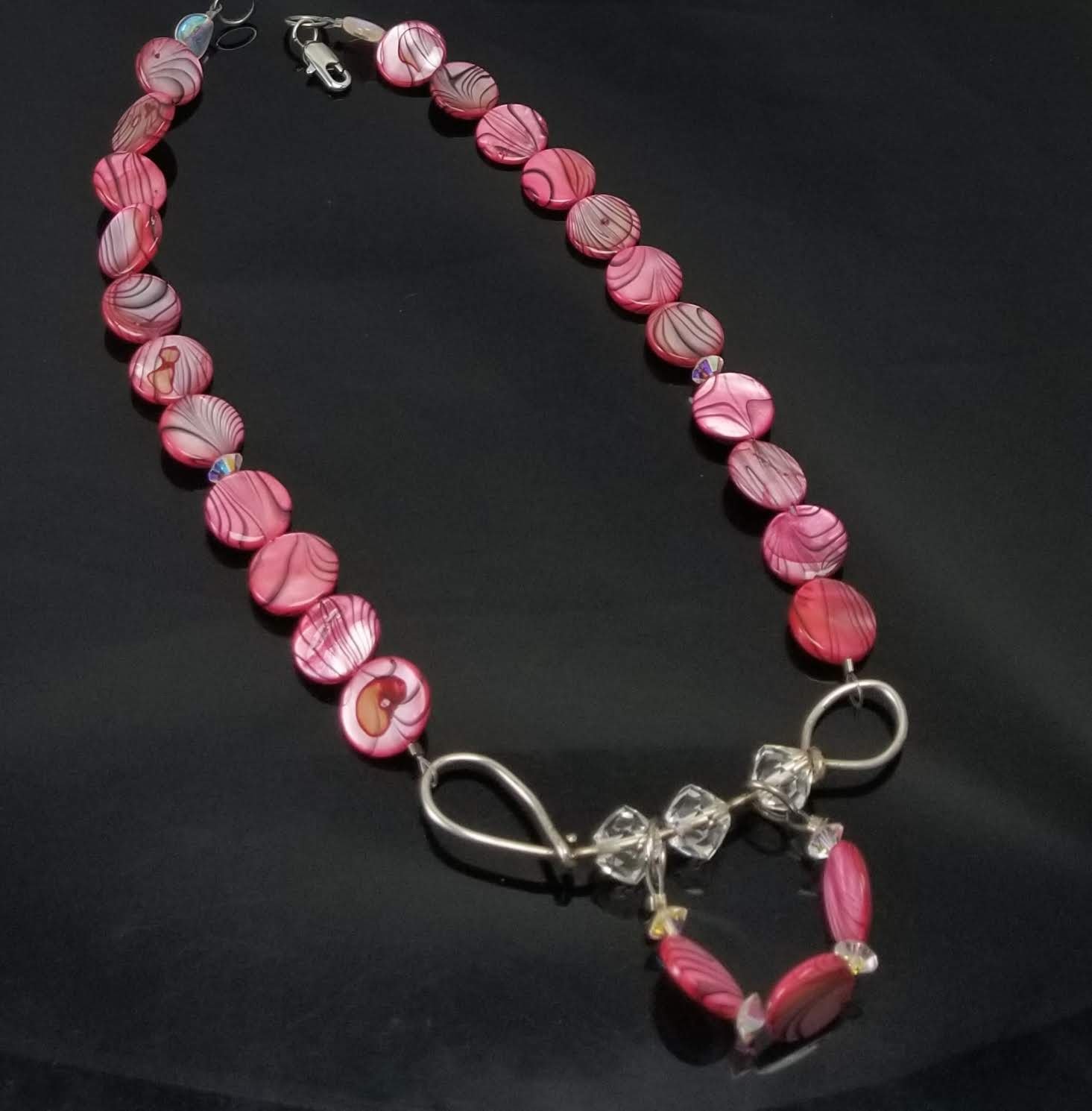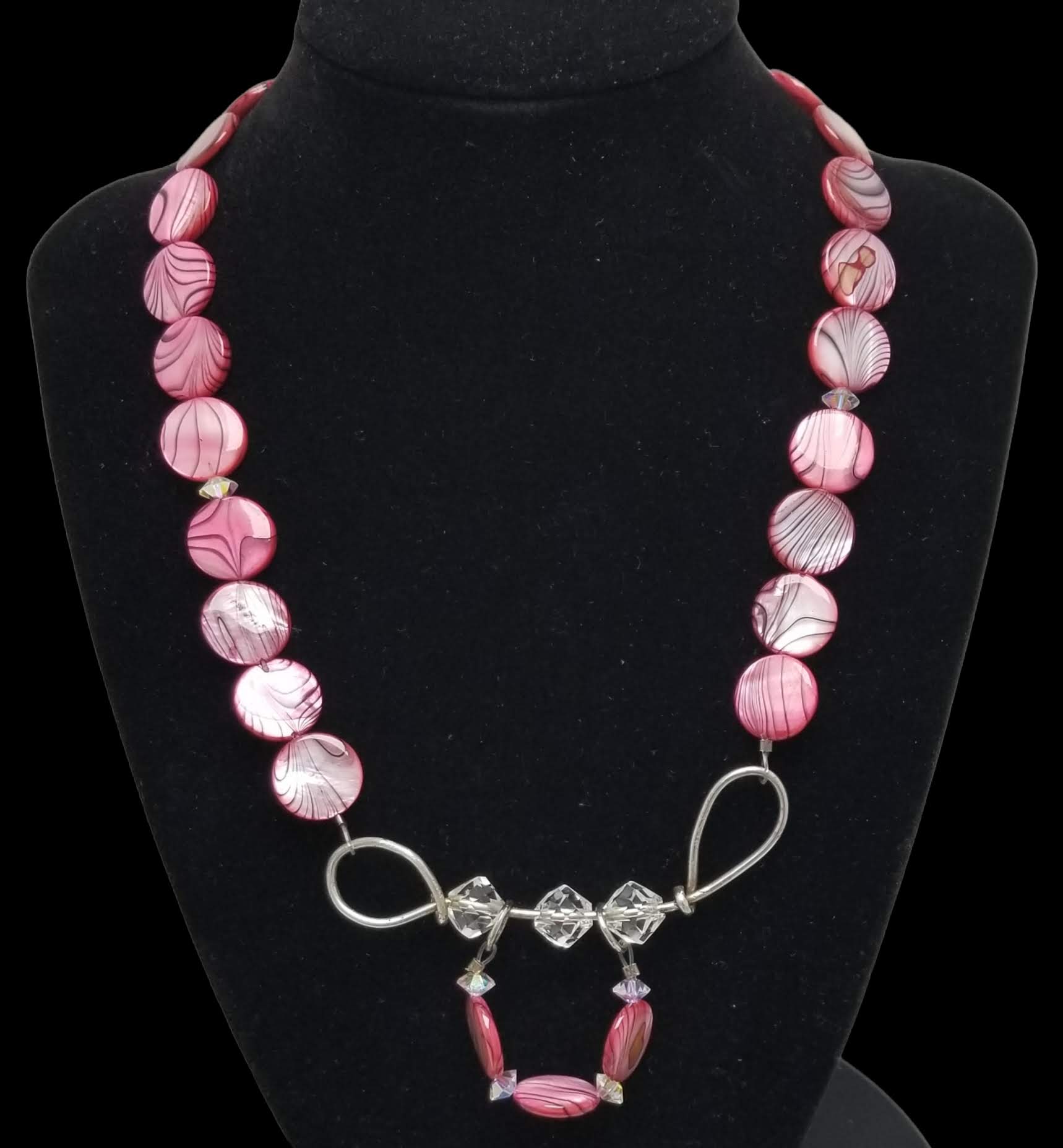Item# 65088-17.5 inch-Fuchsia shell flats, faceted glass. Sterling silver shaped wire front accent. Lobster claw clasp.