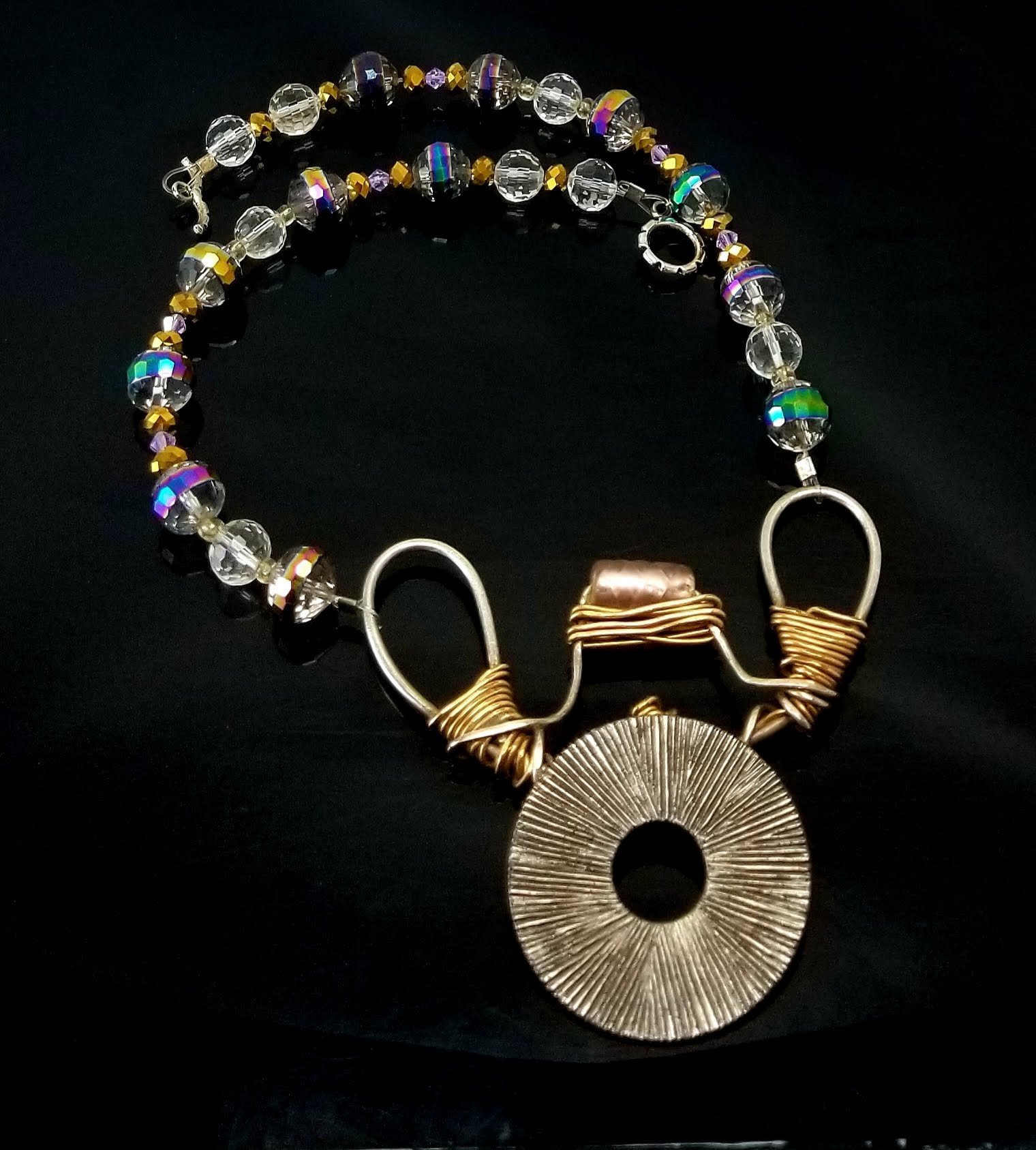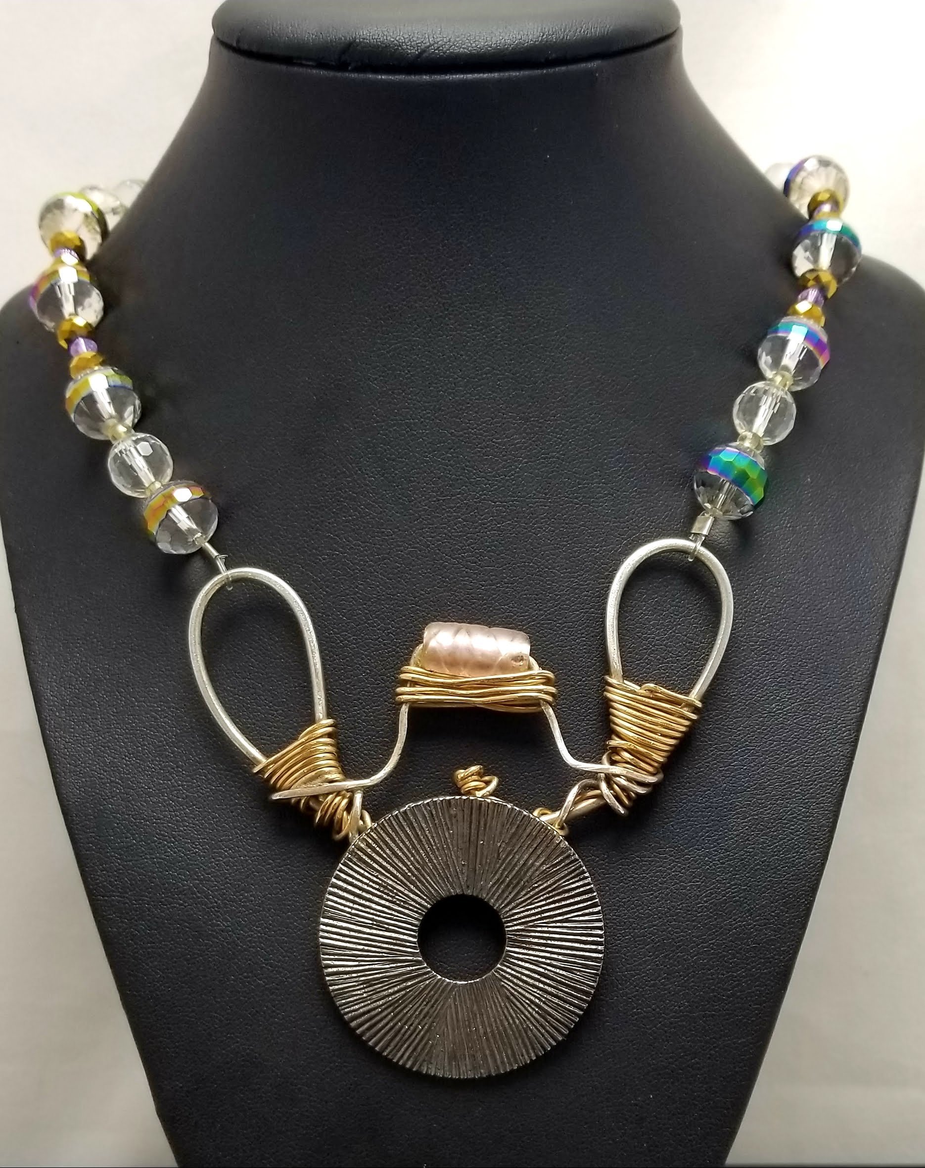 Item# 269800-18 inch- Faceted Iridescent glass mix. Hand shaped sterling silver with gold wire wrap. Metal drop front accent. Silver toggle clasp.
