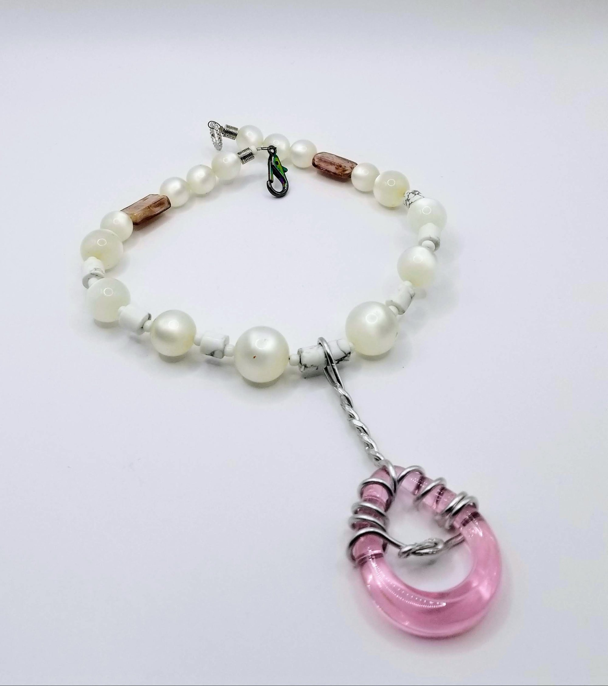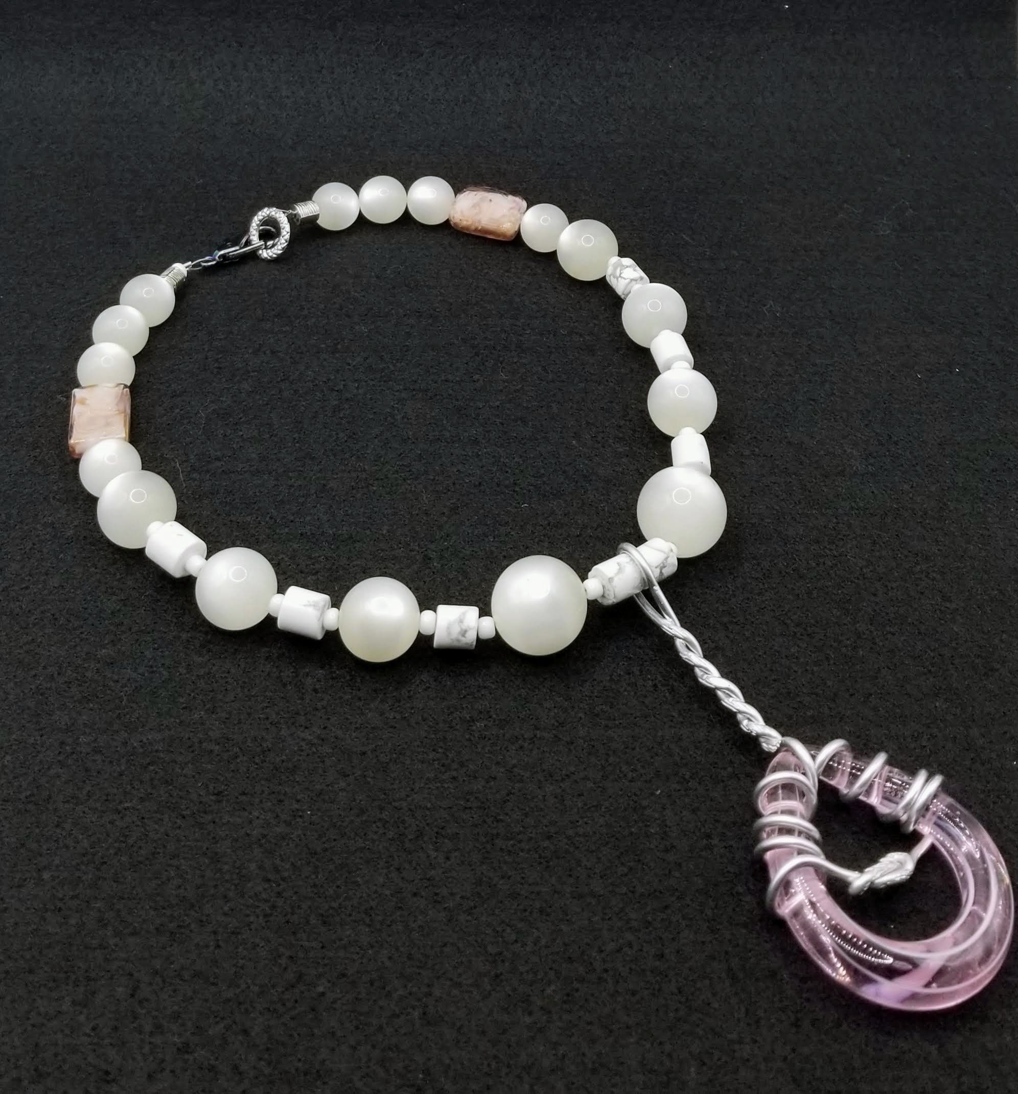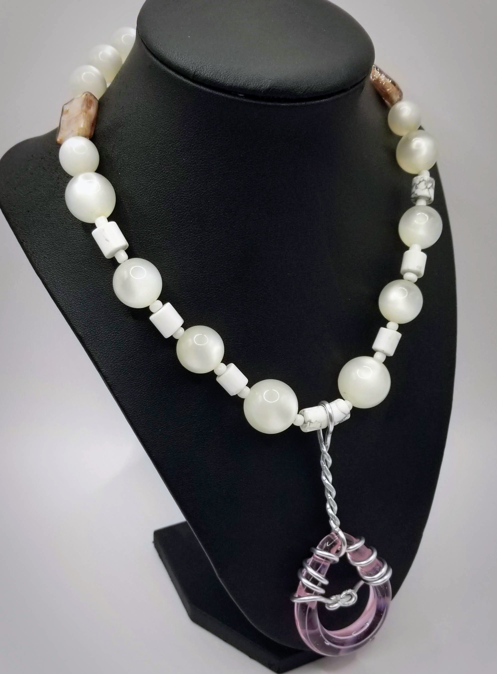 Item #900185-17 inch Soft glow glass bead mix, howlite bead and flat glass back accents. Iridescent lobster claw clasp.