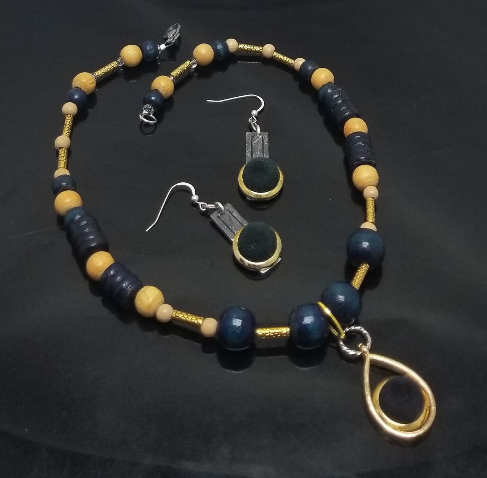 Item #811202-17.5 inch Wood blend mix. Soft puff deco accents. Earrings 1.5 inch Sterling Silver hooks