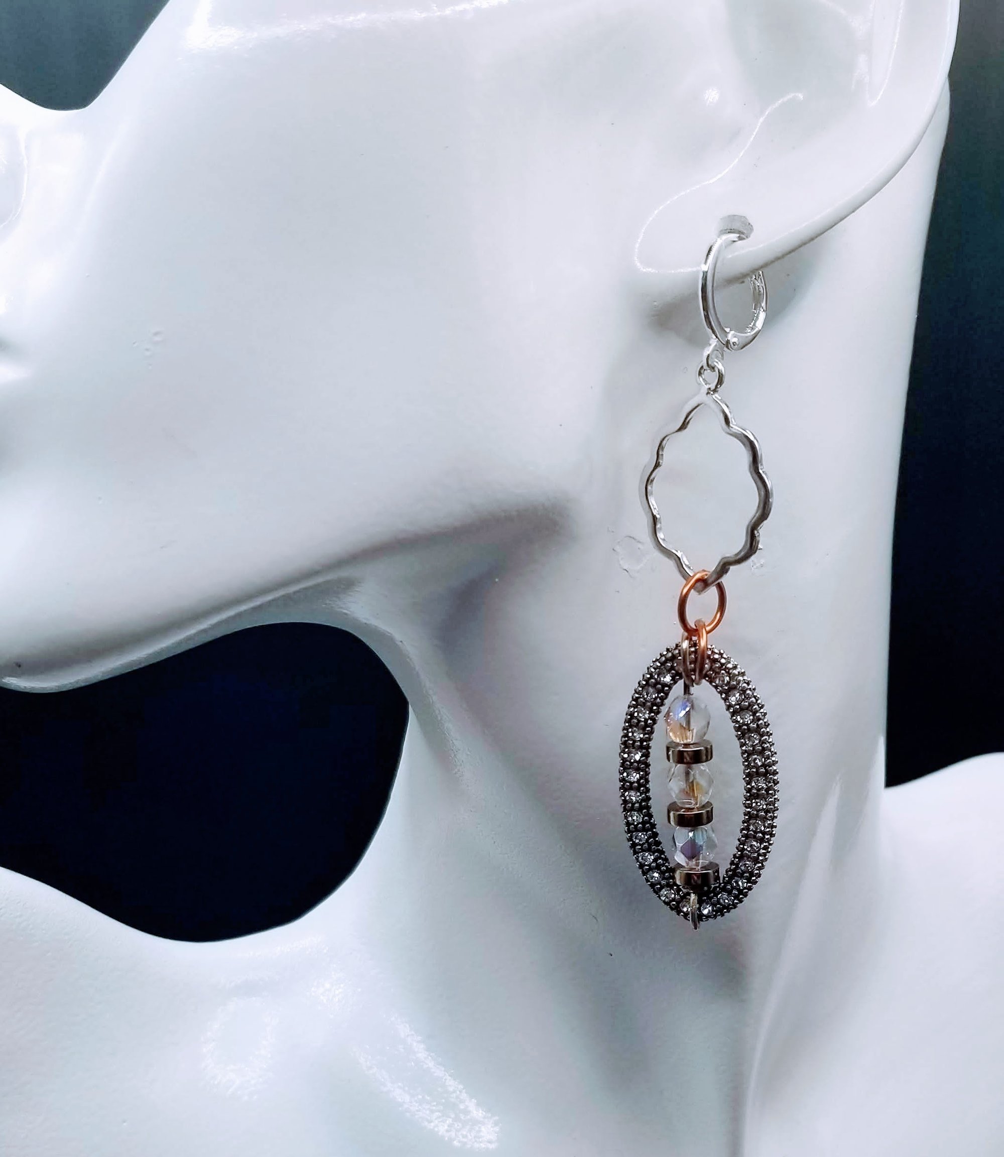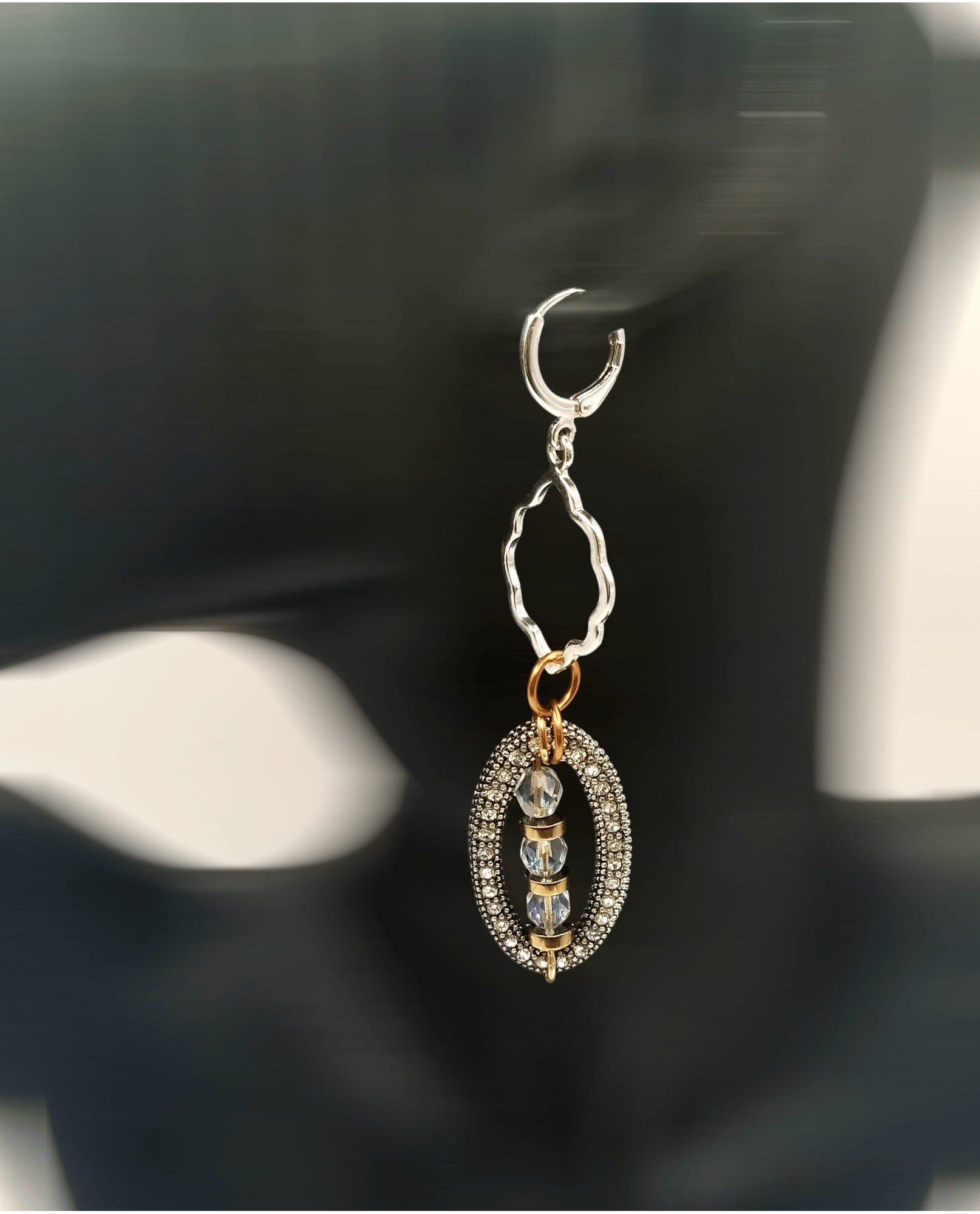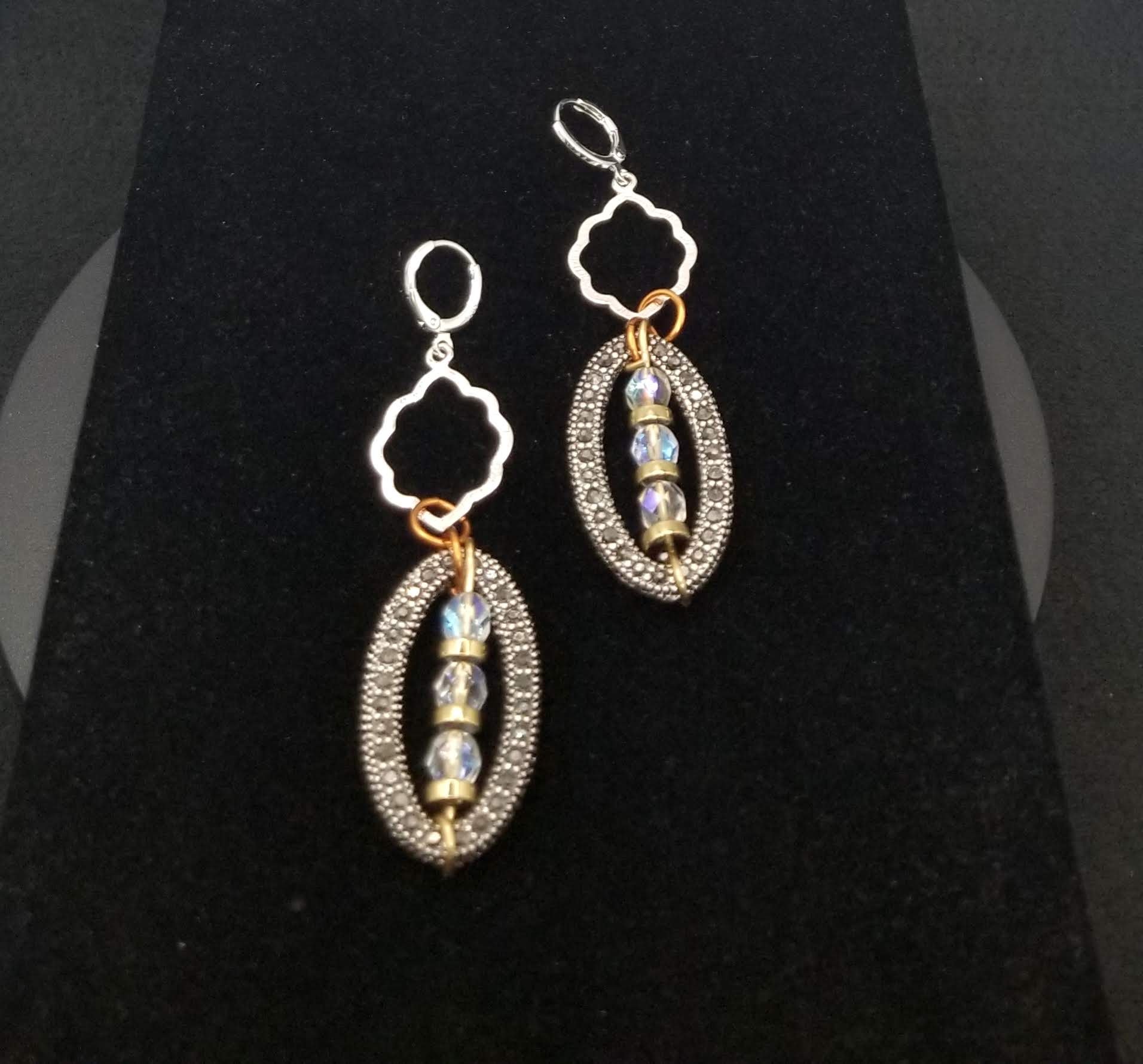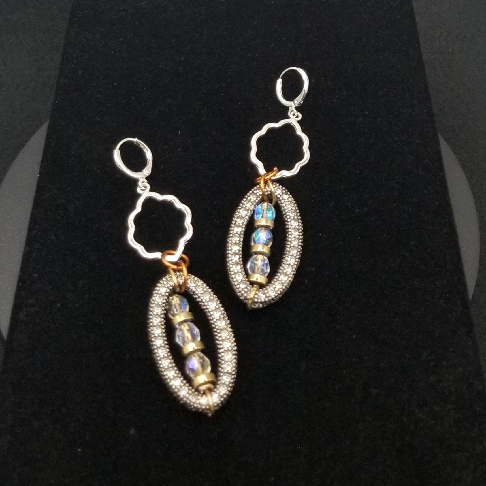 Item #901362 - 3 inch - Dual sided stone sets paired with iridescent faceted glass and gold disc filler accents, deco open face silver tops. Sterling Silver round leavers.