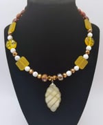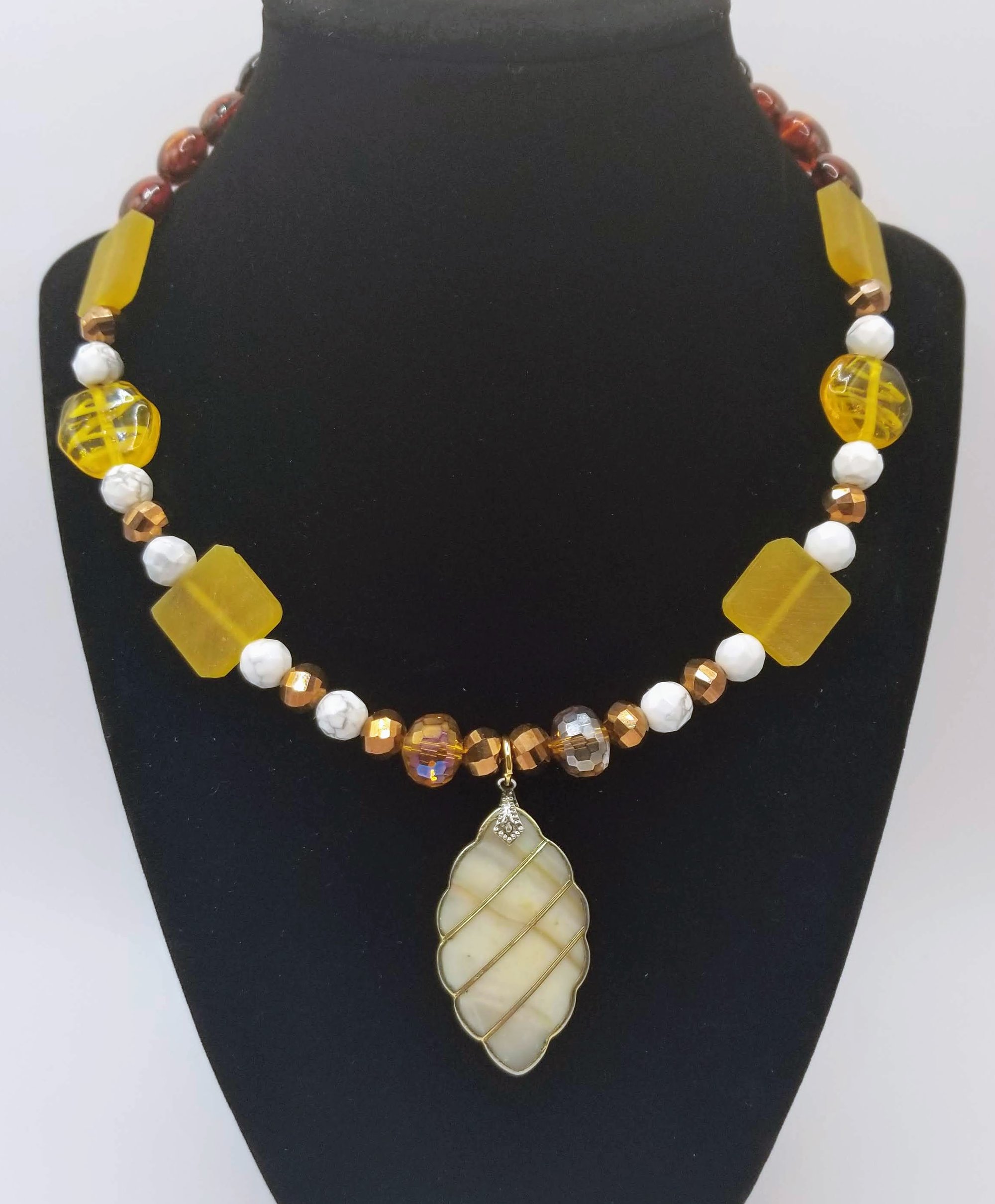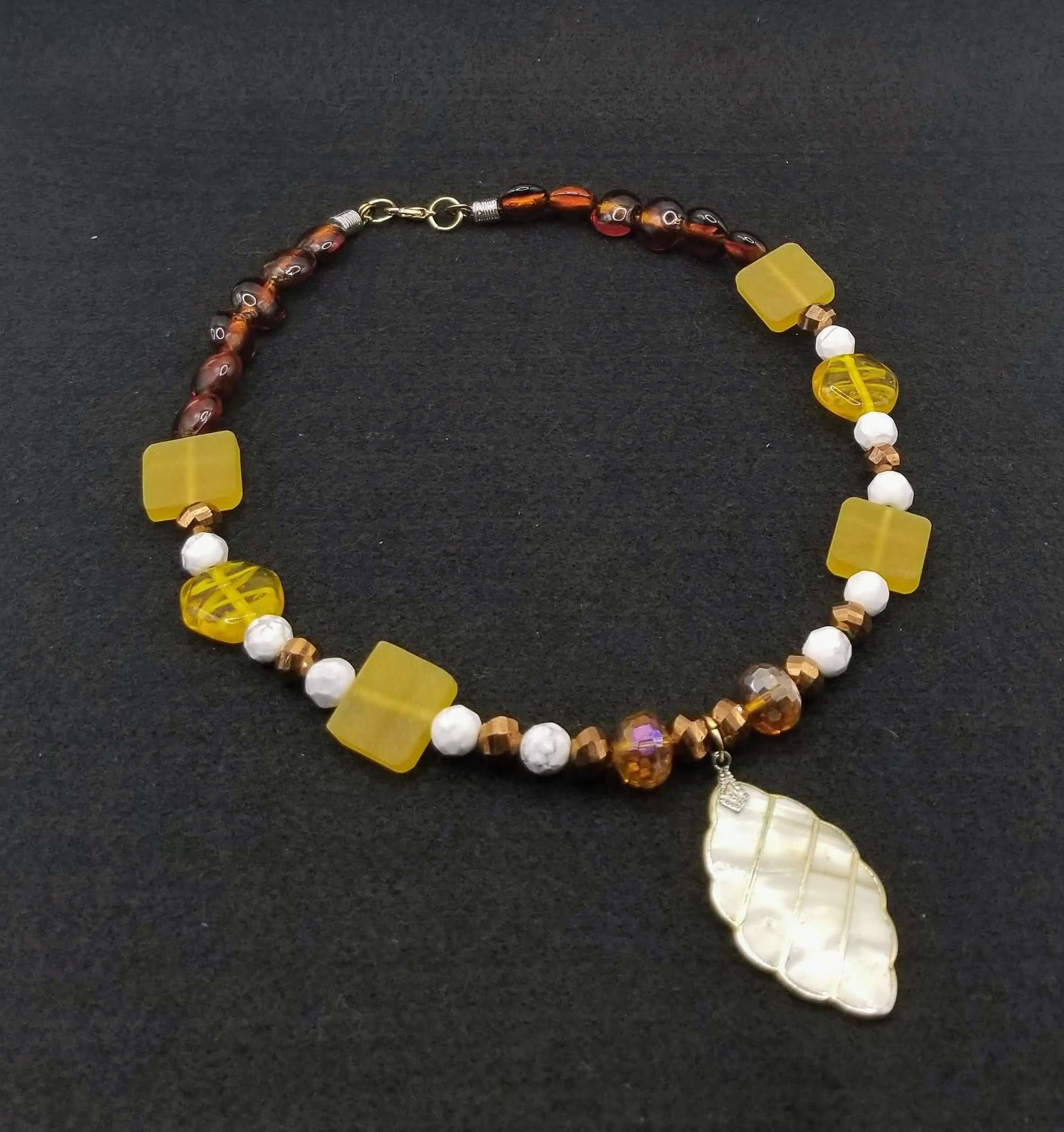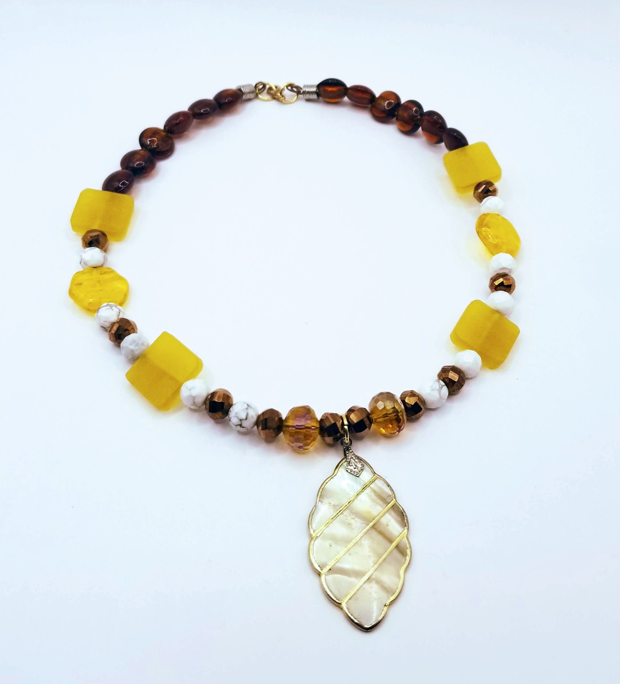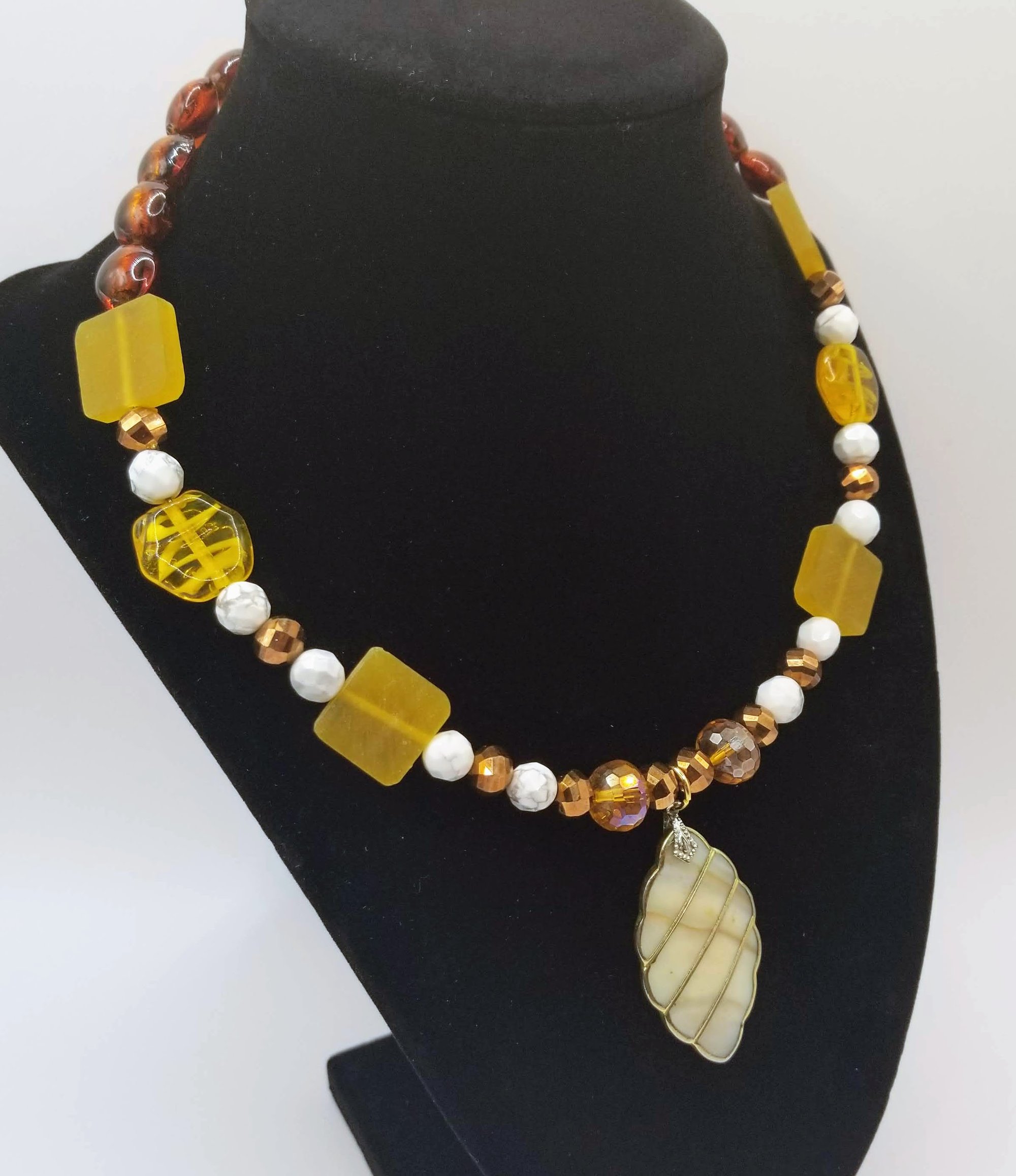 Item# 900922 - 17 inch - Rondella, Howlite, flat glass with flat shell accent drop. Gold lobster claw clasp.