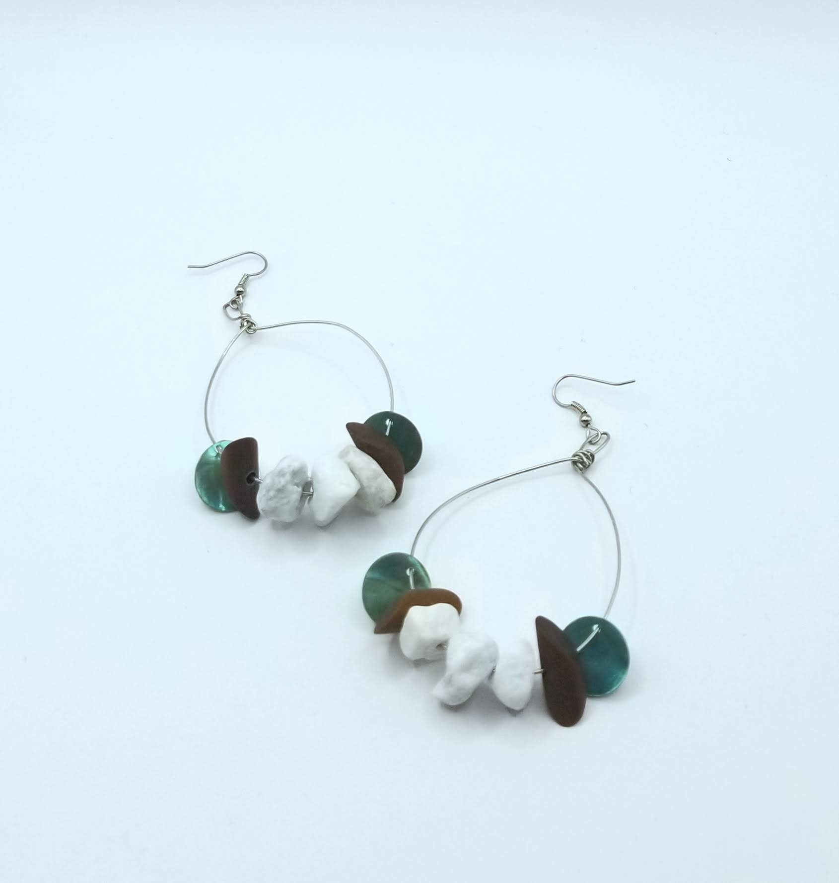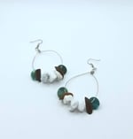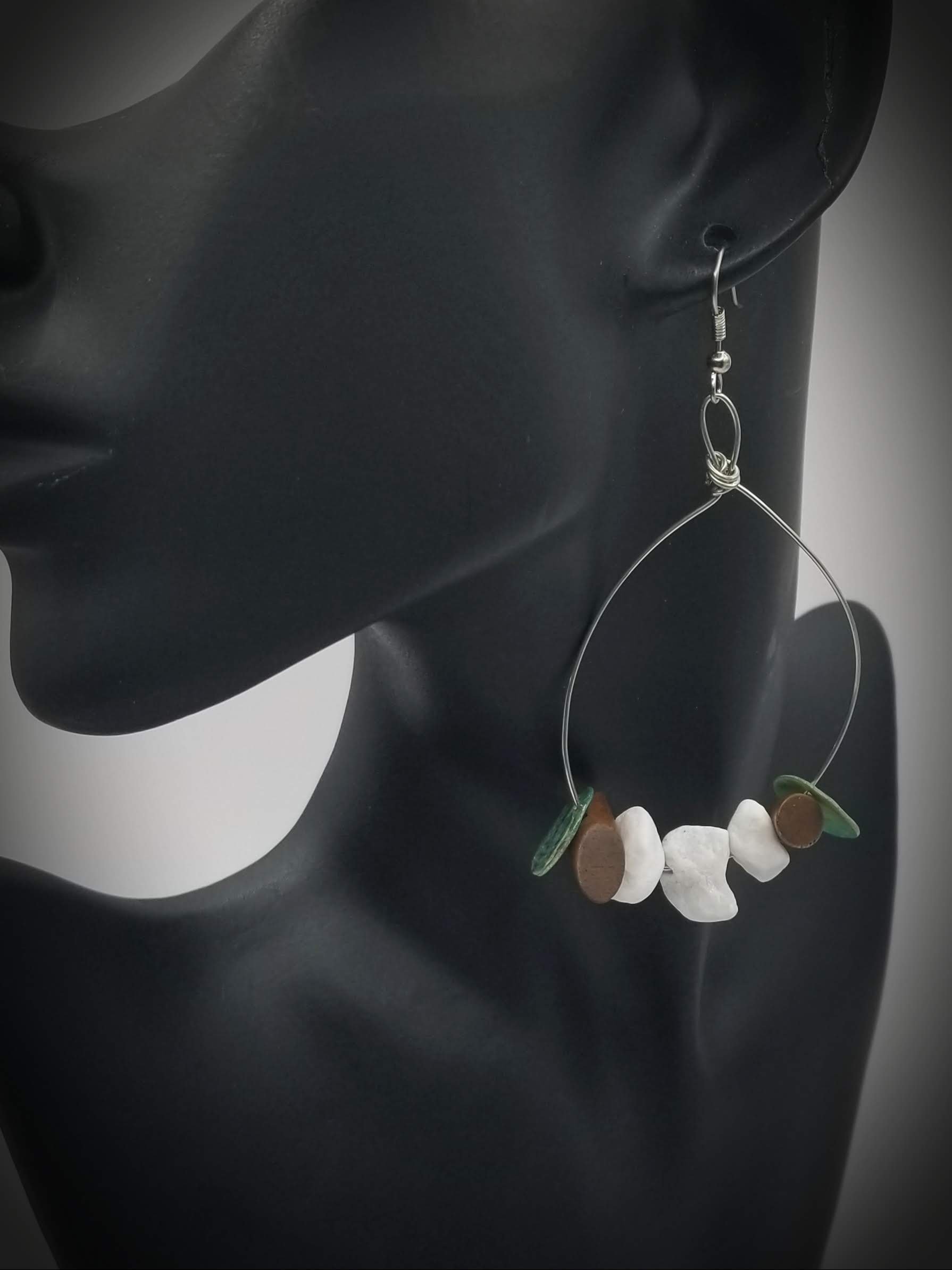 Item #900426 -3.5 inch Wire shaped open face loops with howlite, wood and shell flat side accents. stainless steel hooks.