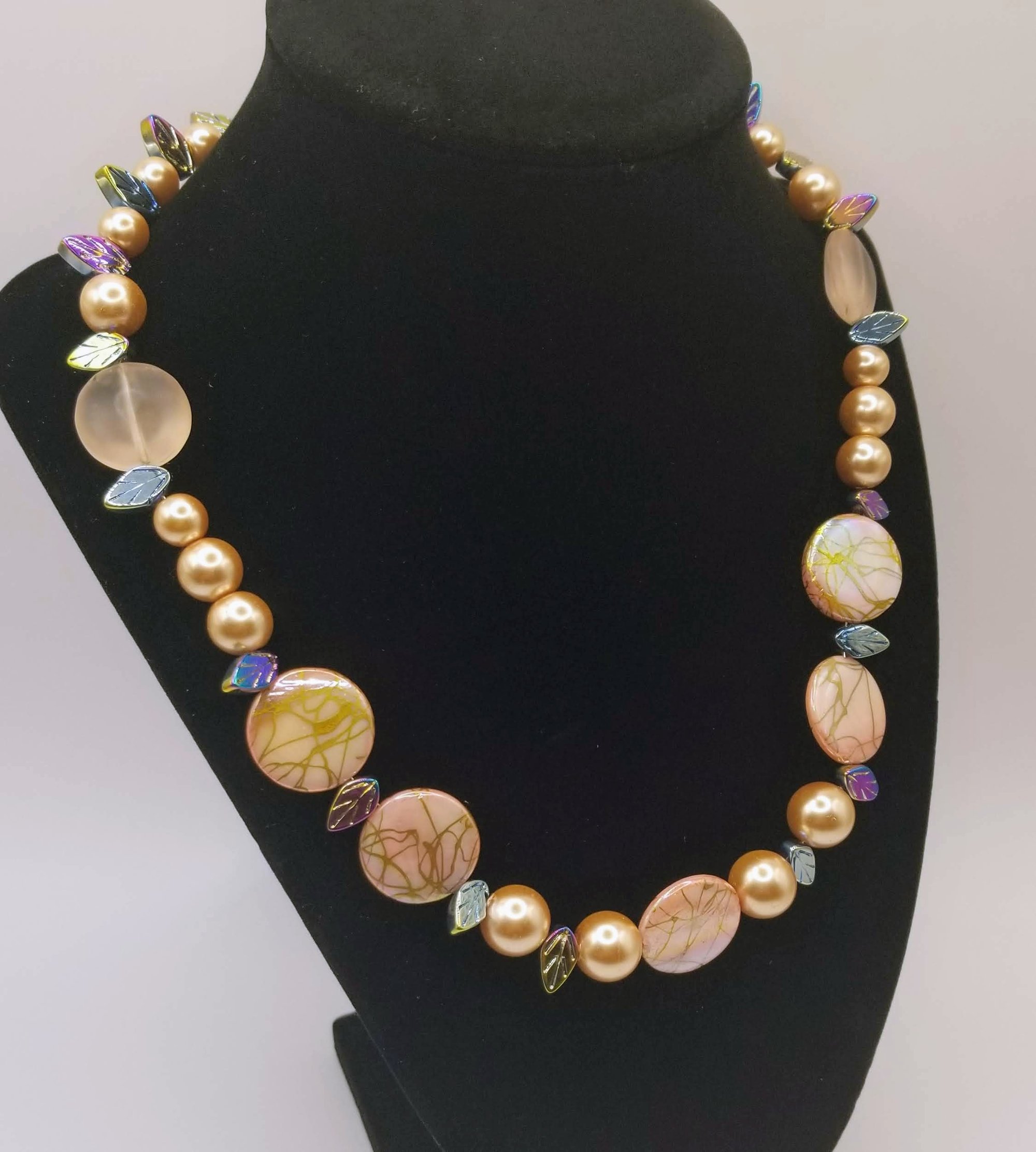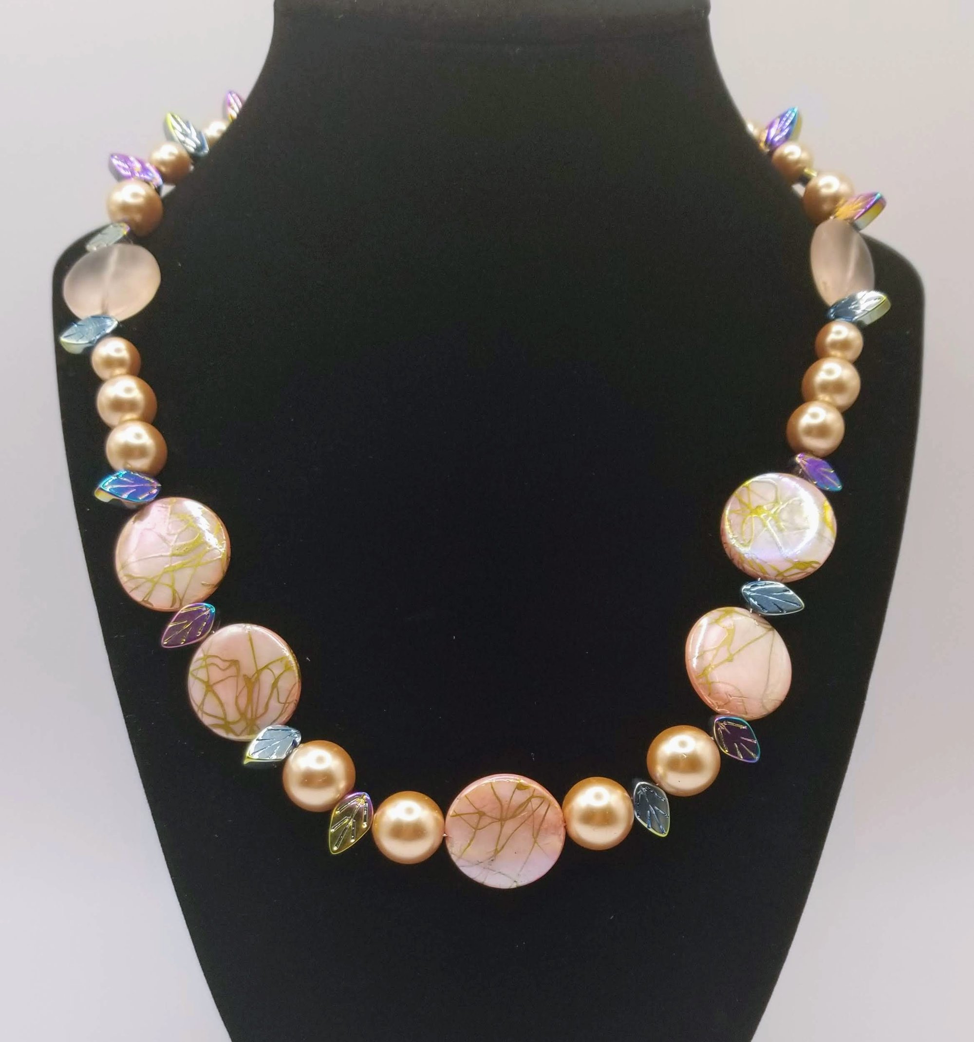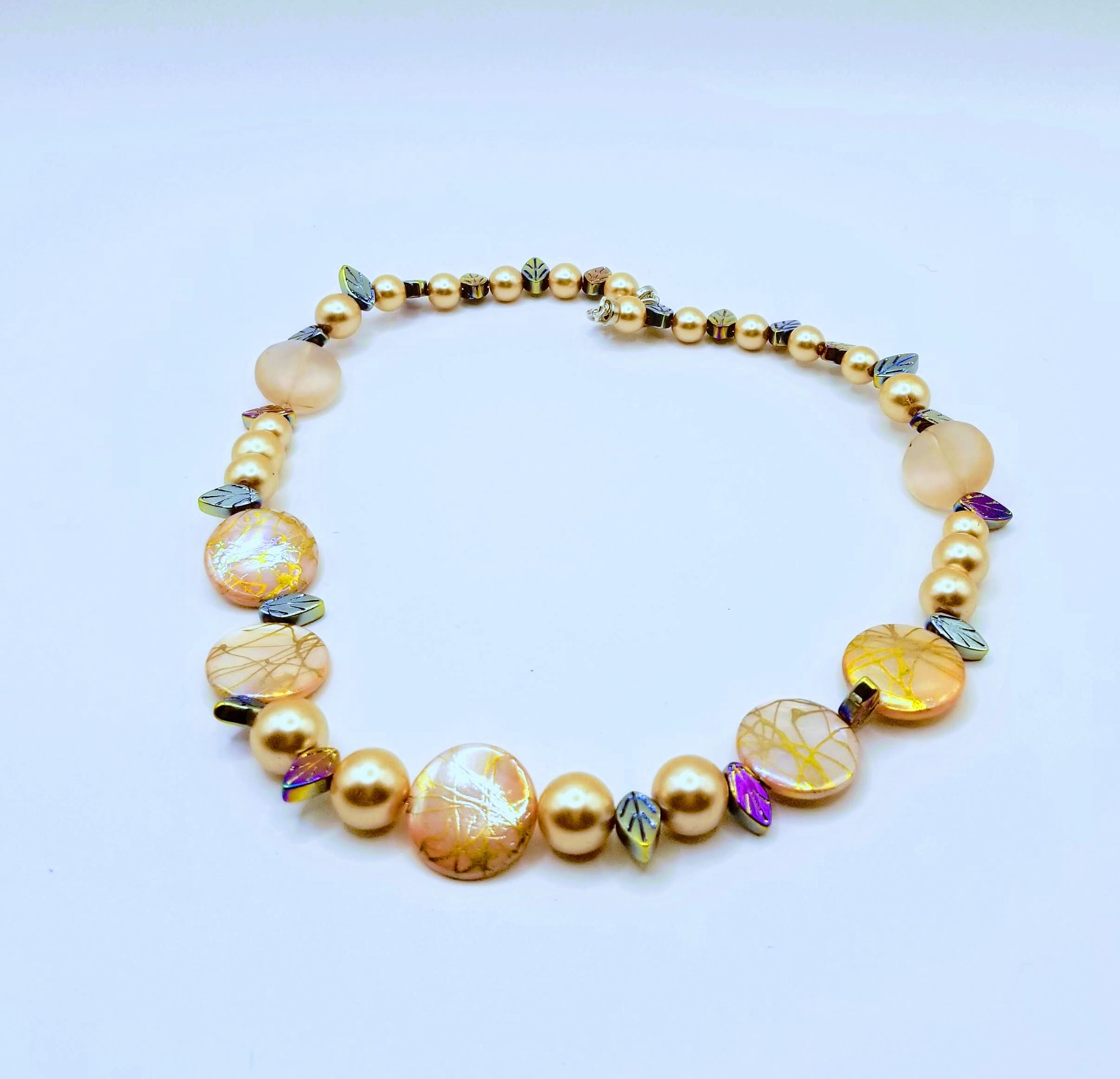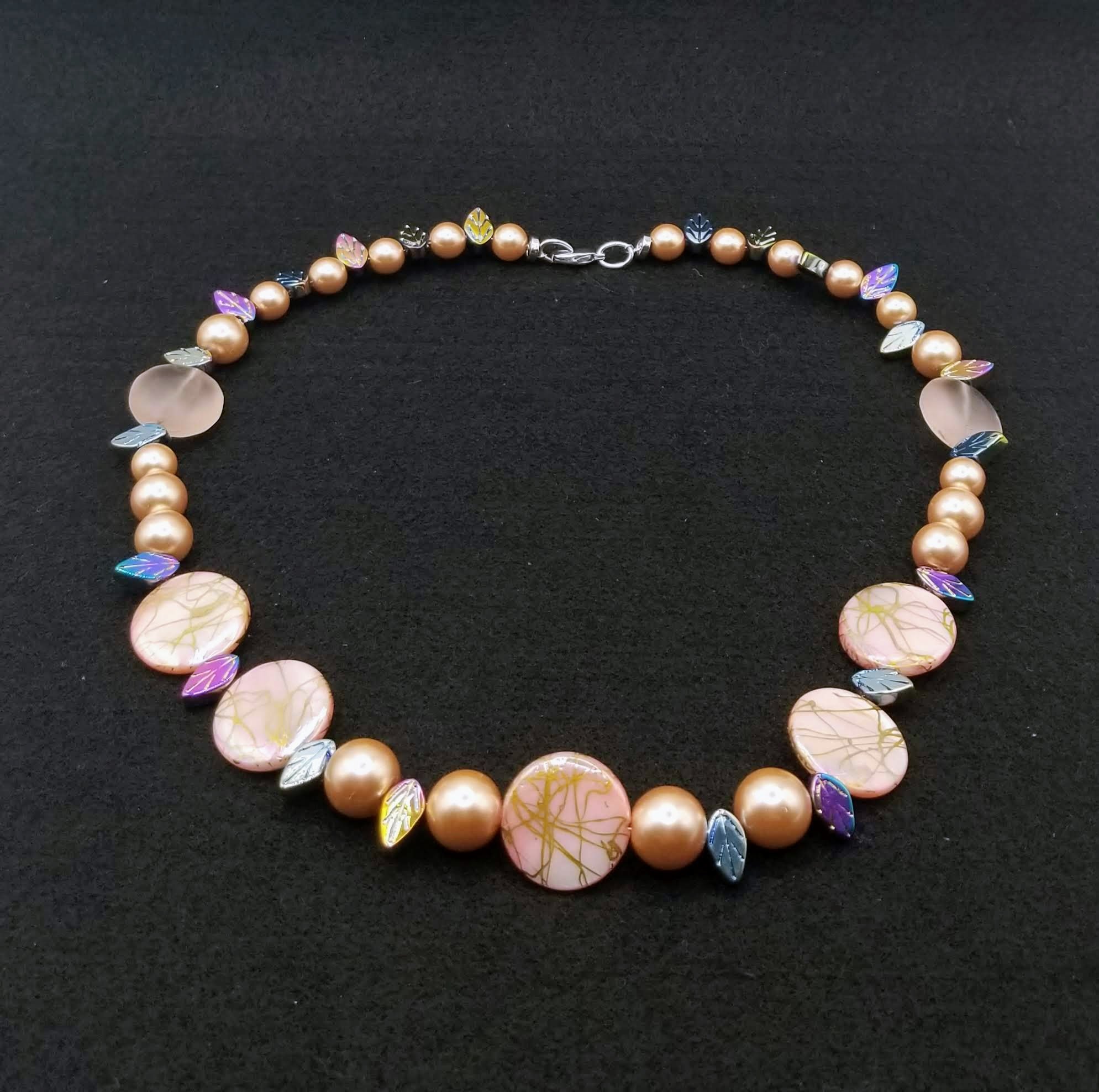 Item# 900819 - 19 inch - Splash flats paired with glass gloss pearl and irridescent mix accents. Silver lobster claw clasp.