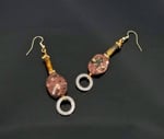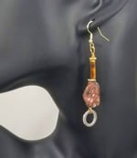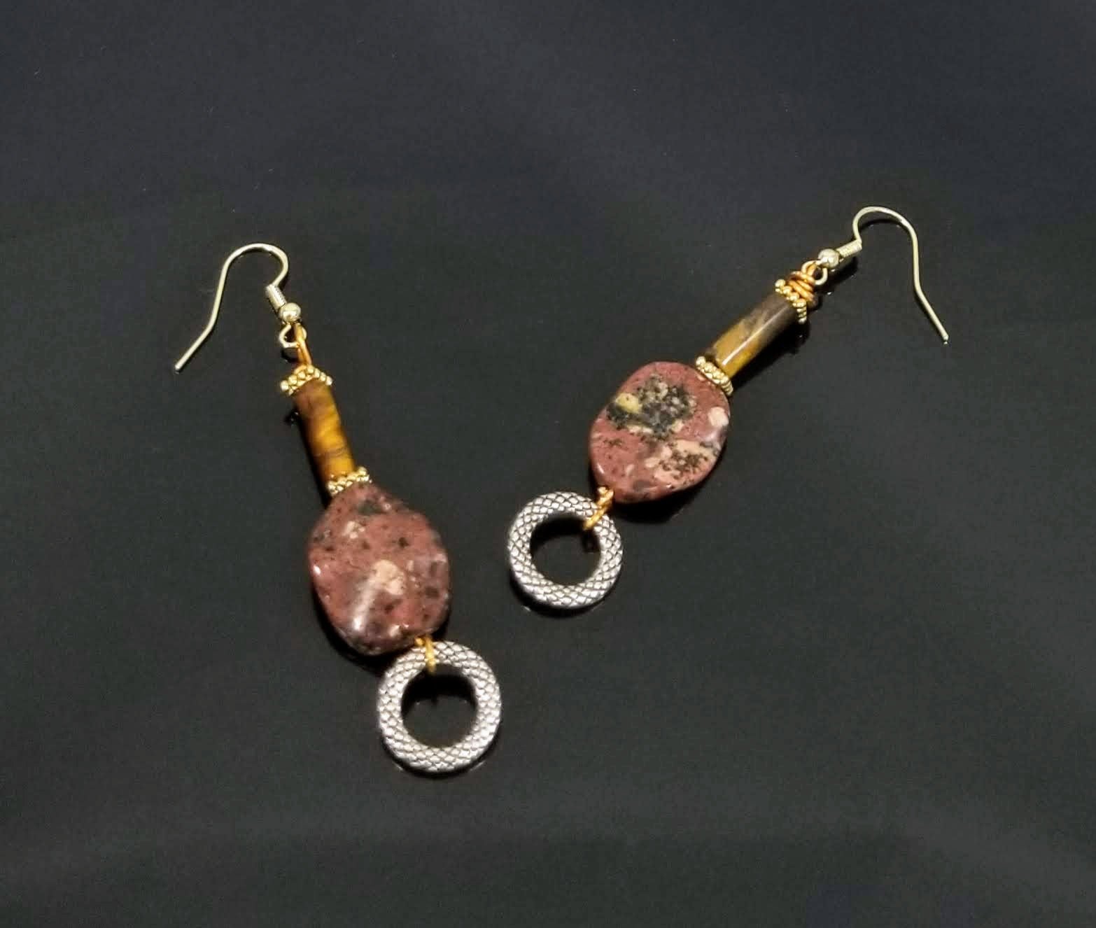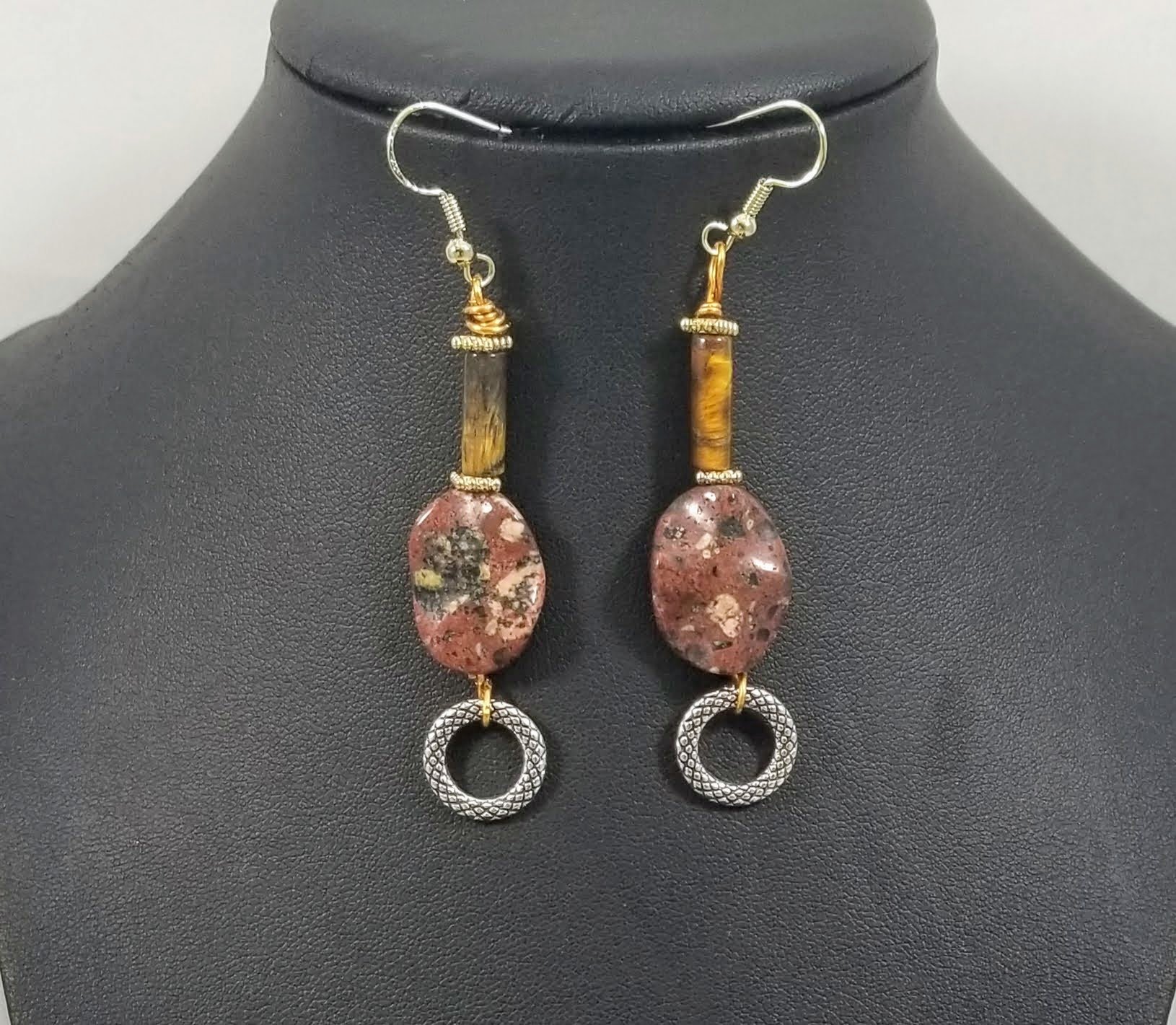 Item #723644-2.5in long-Fossil stone paired with Tiger eye tubes. Open face silver metal accent drops. Sterling Silver hooks