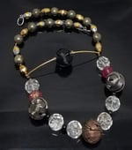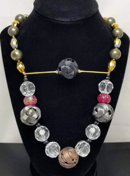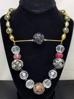 Item# 711213- 18 inch Mix metal collage, faceted glass, gold wire center connect. Stone with Silver/Gold bead back accents. Silver toggle clasp