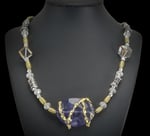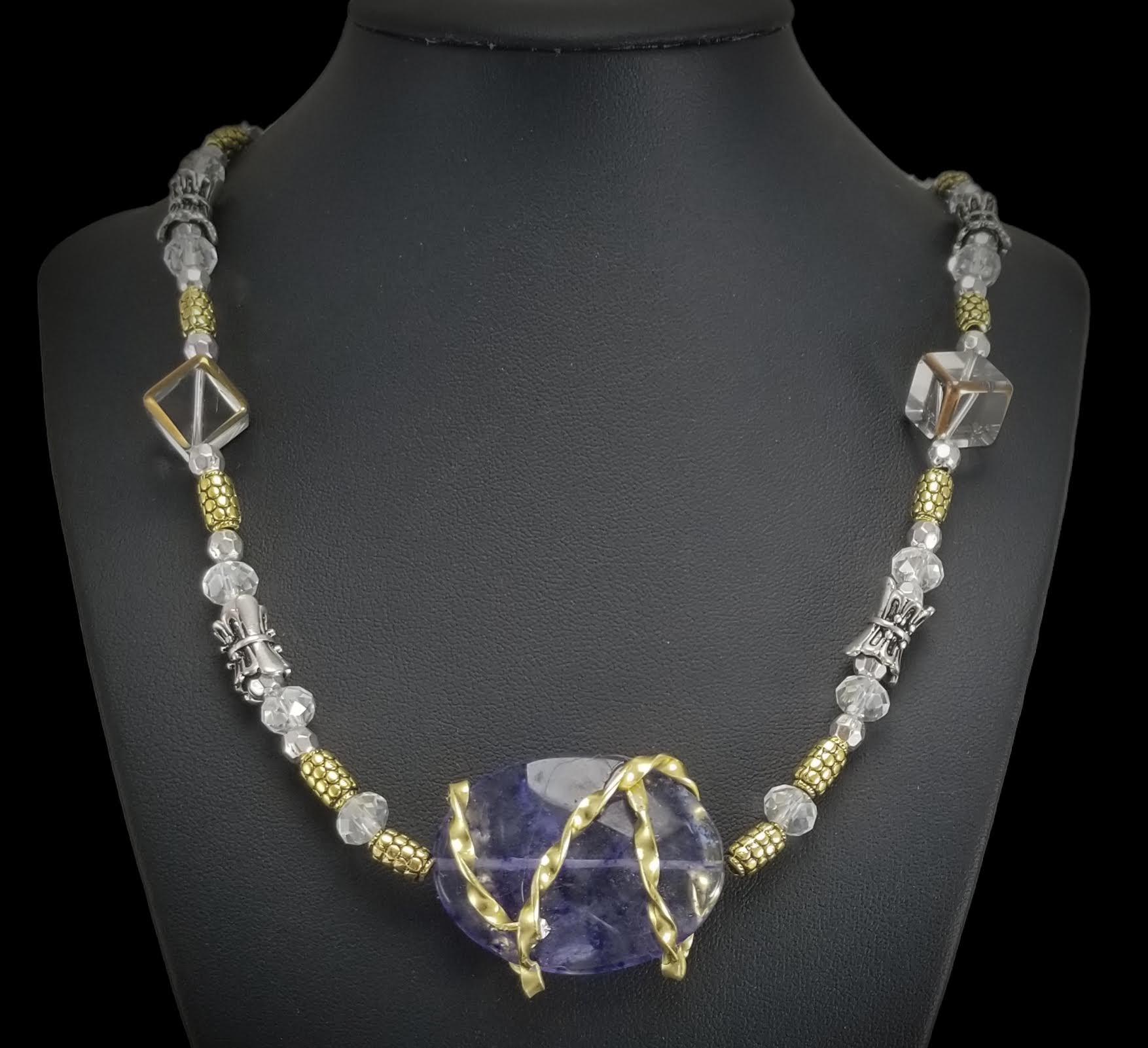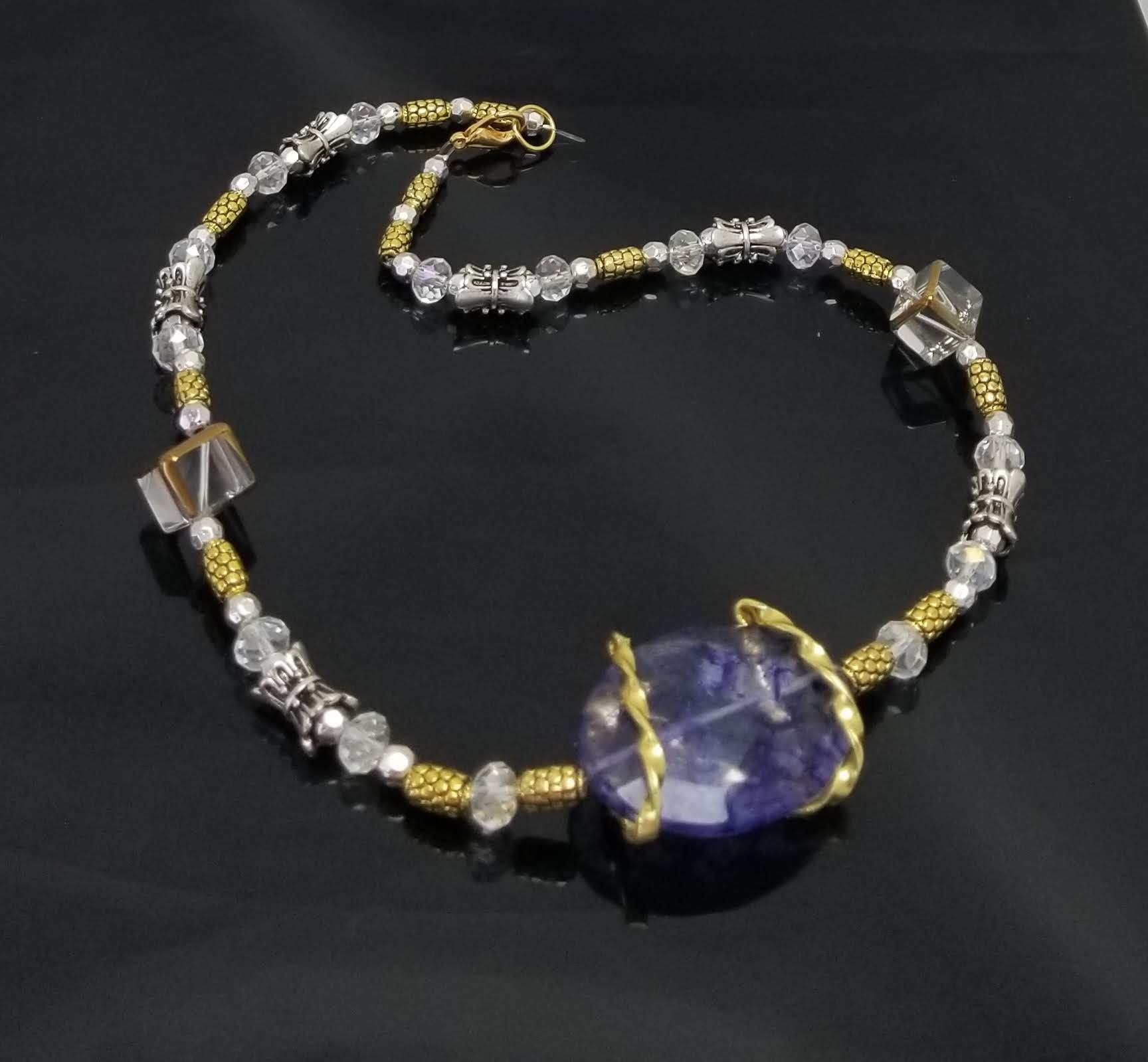 Item #801329-19.5 inch. Array of mixed elements. Gold/Silver bead accents, gold trim cube side accents. Rondelle glass. Aluminum gold wrap over faceted center stone. Gold lobster claw.