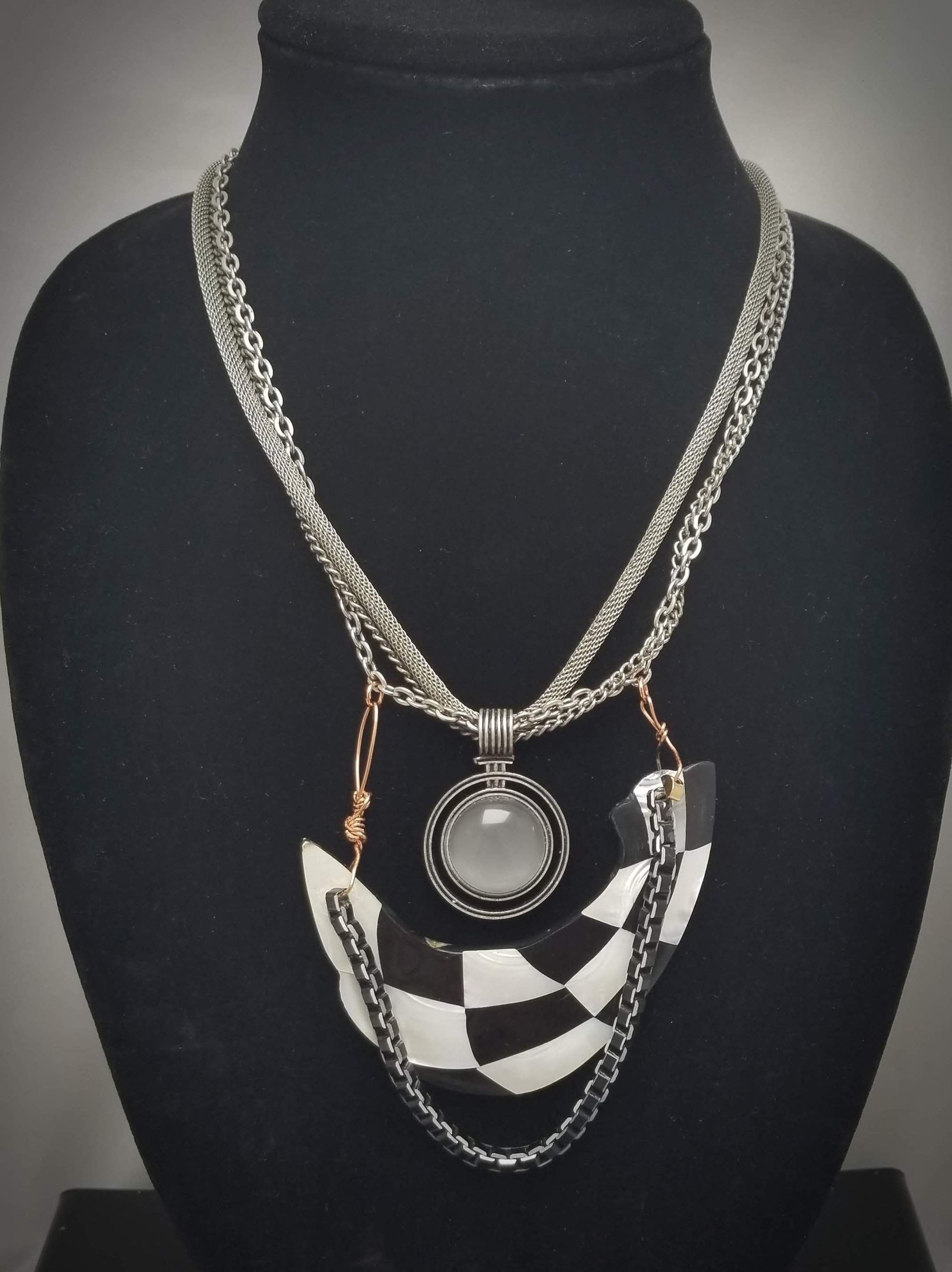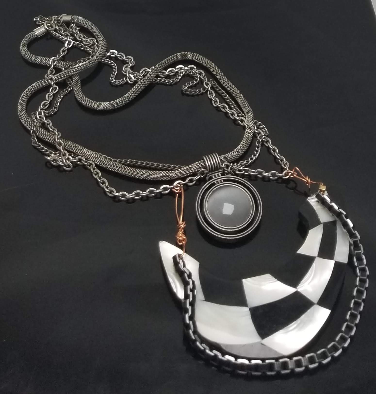 Item# 806714 - 21.5 inch Checkered jet/pearl flat drop, metal chain front drop accent. Silver back chain mix. Toggle clasp.