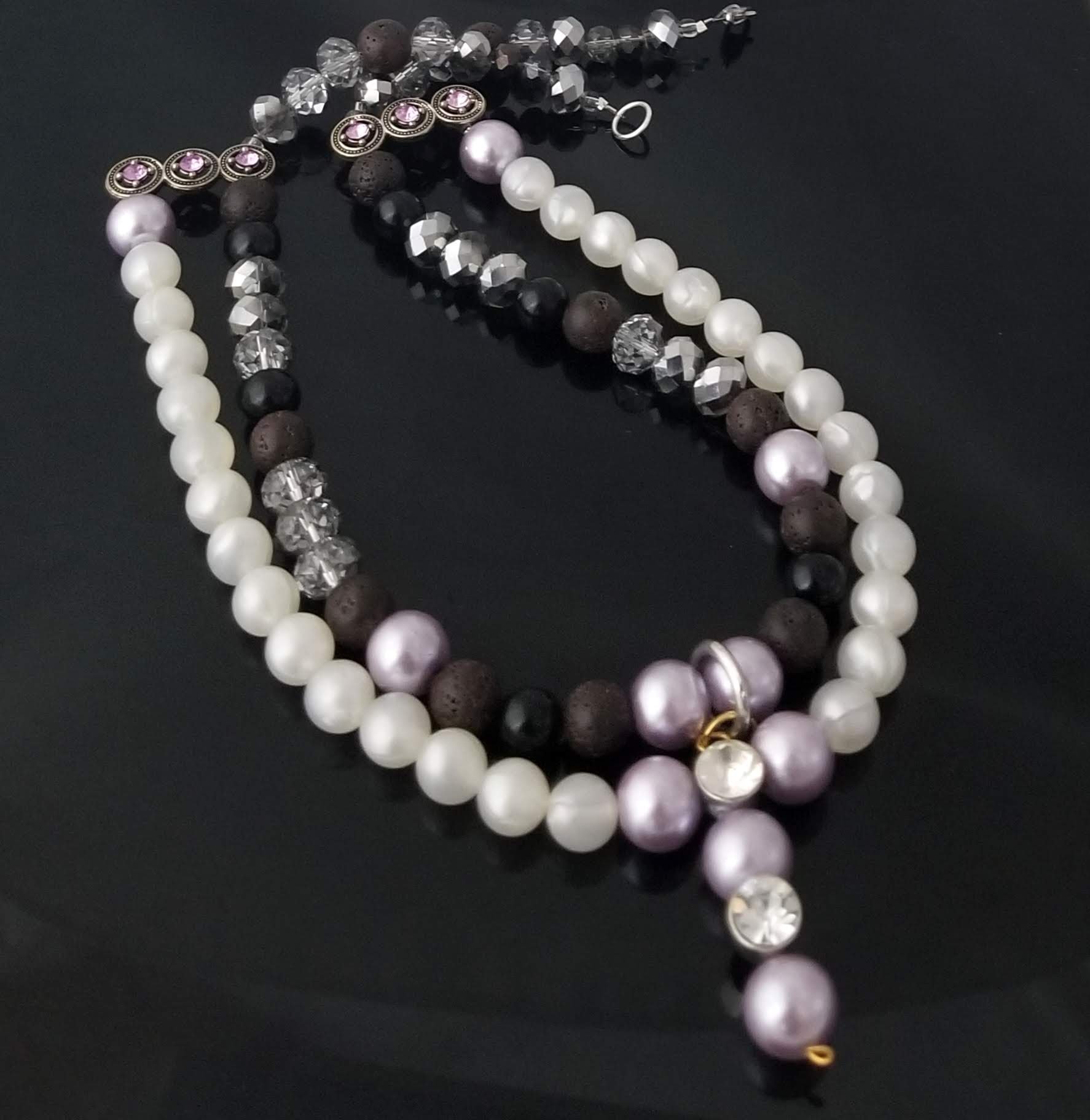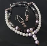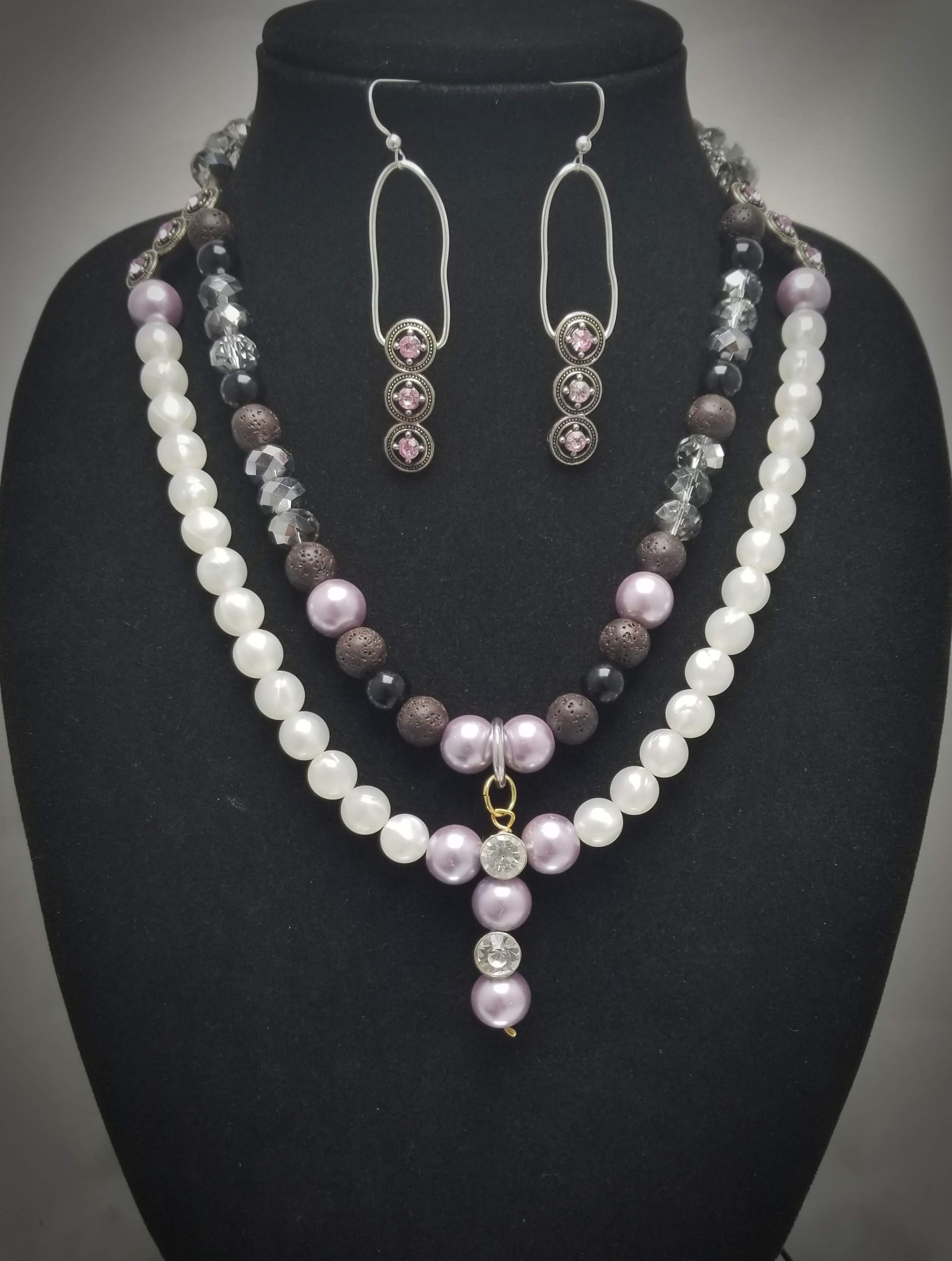 Item #st811169-20 inch-Double strand connect, multi mix bead blend, side metal stone accents. Center drop. Silver lobster claw clasp. Earrings 2.5 inch, on SS flat hooks.