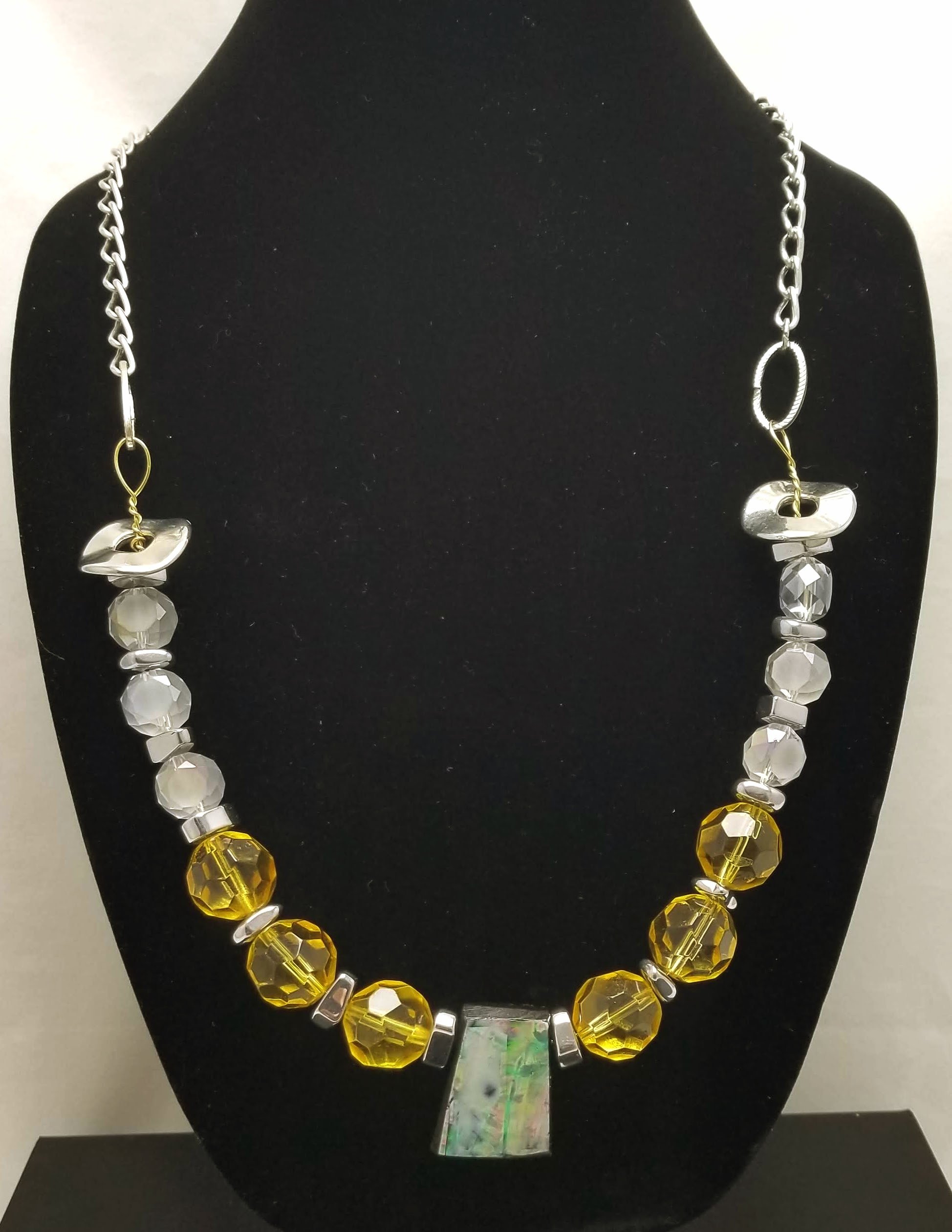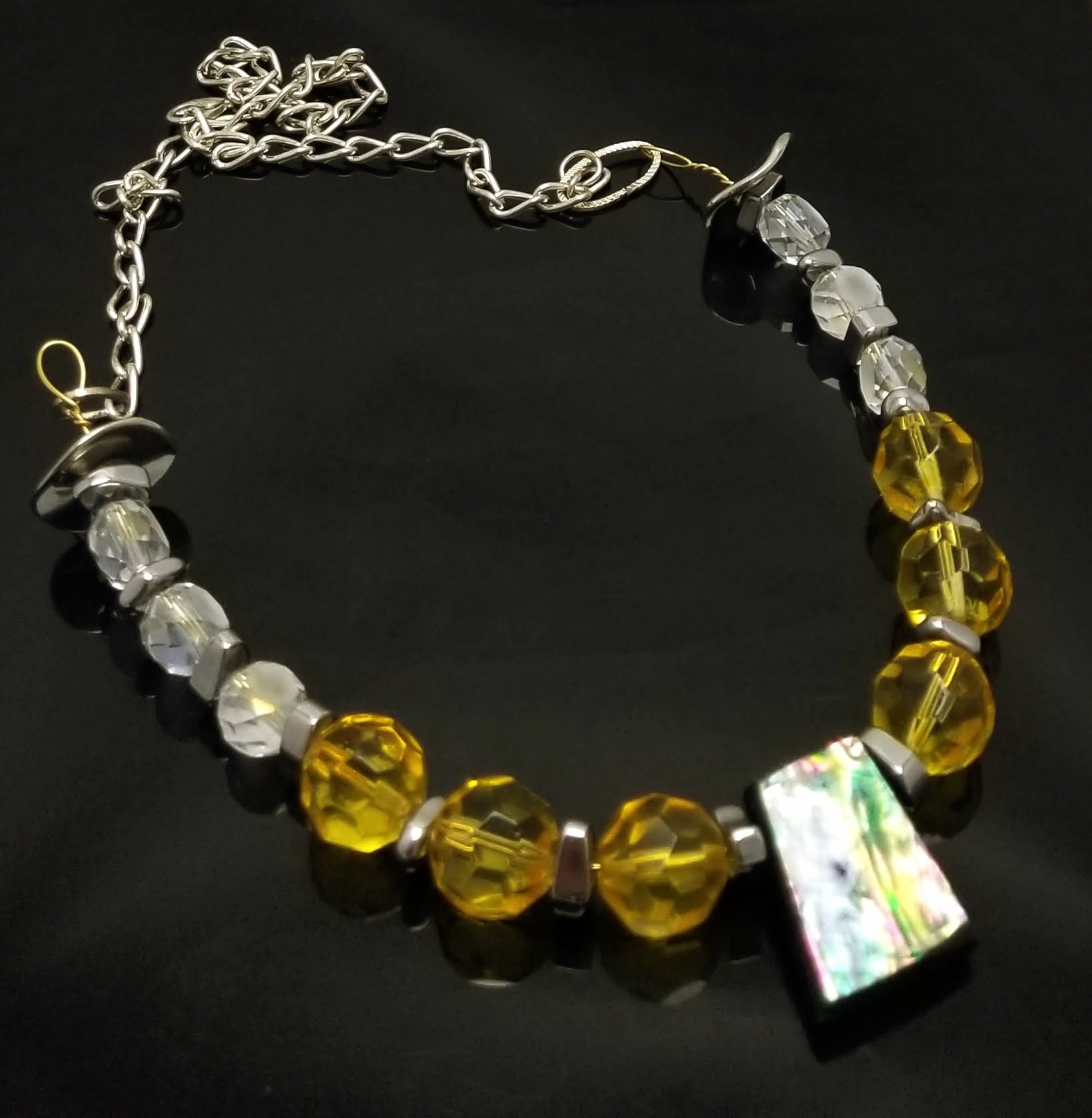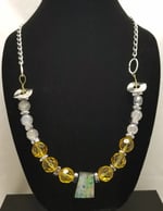 Item #806702- 30 inch faceted glass/frost mix. Front shell deco accent. Gold wire twist connect with Silver back chain/lobster claw.