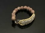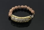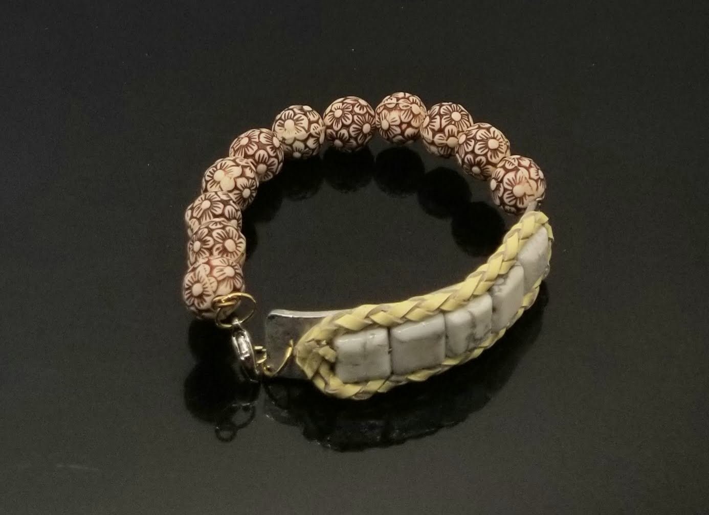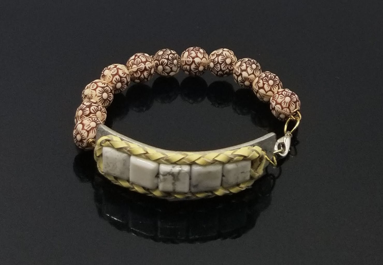 Item #900264- 8 inch Floral deco, flexi wire, Yellow leather cording, Howlite flat bead wrap on silver metal flat. Floral deco back design.