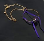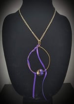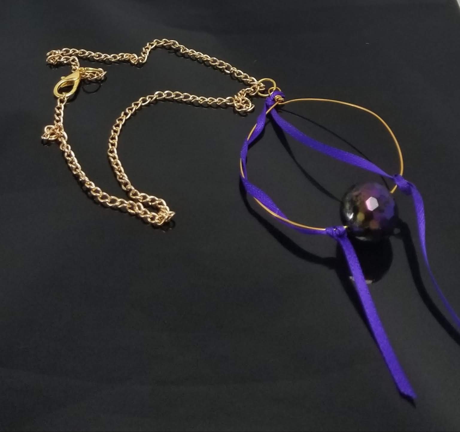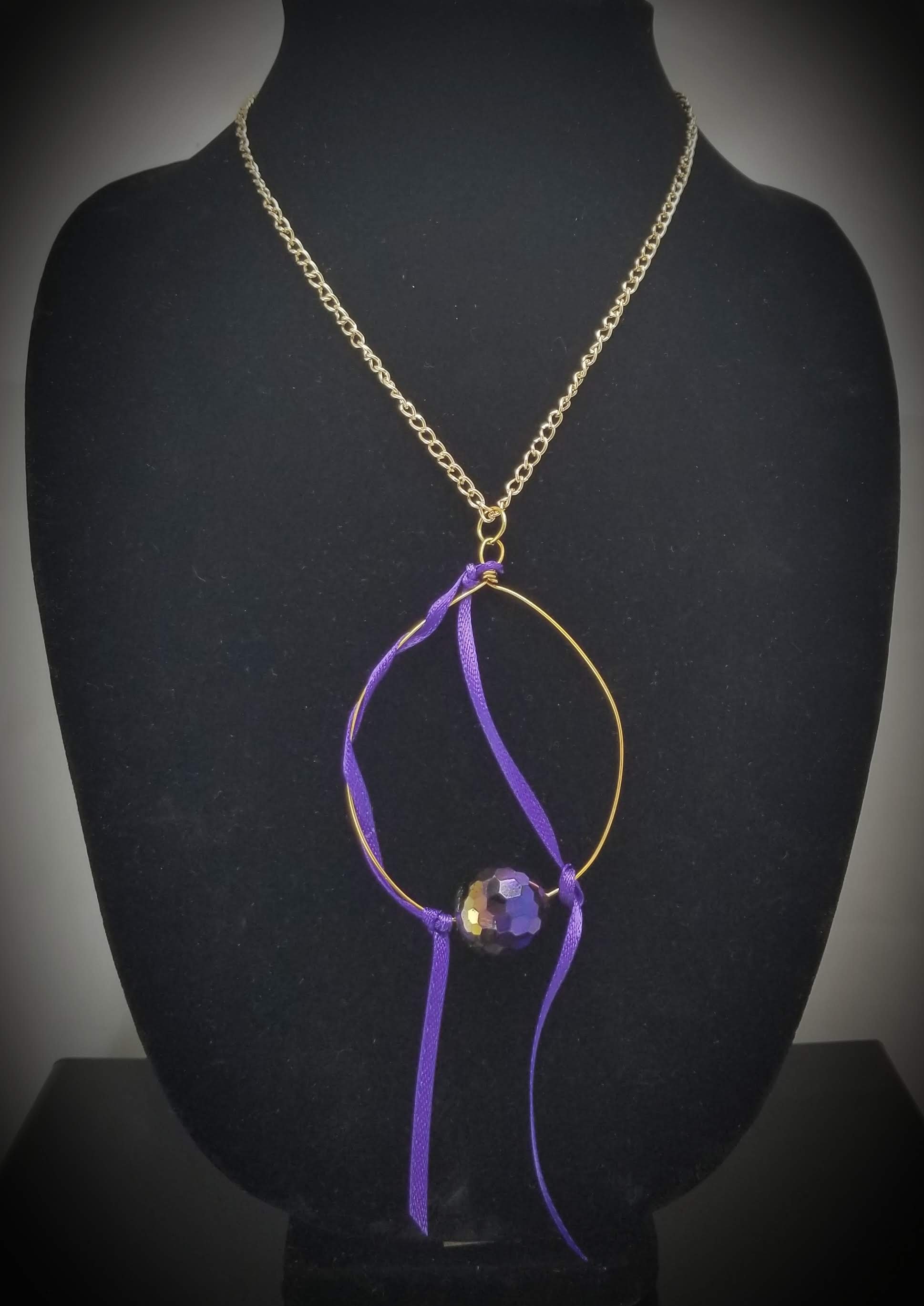 Item #801426-18 in 3.5 in drop. Hand shaped wire with intertwined ribbon accent. Iridescent faceted glass center beam. Gold chain/lobster claw clasp.