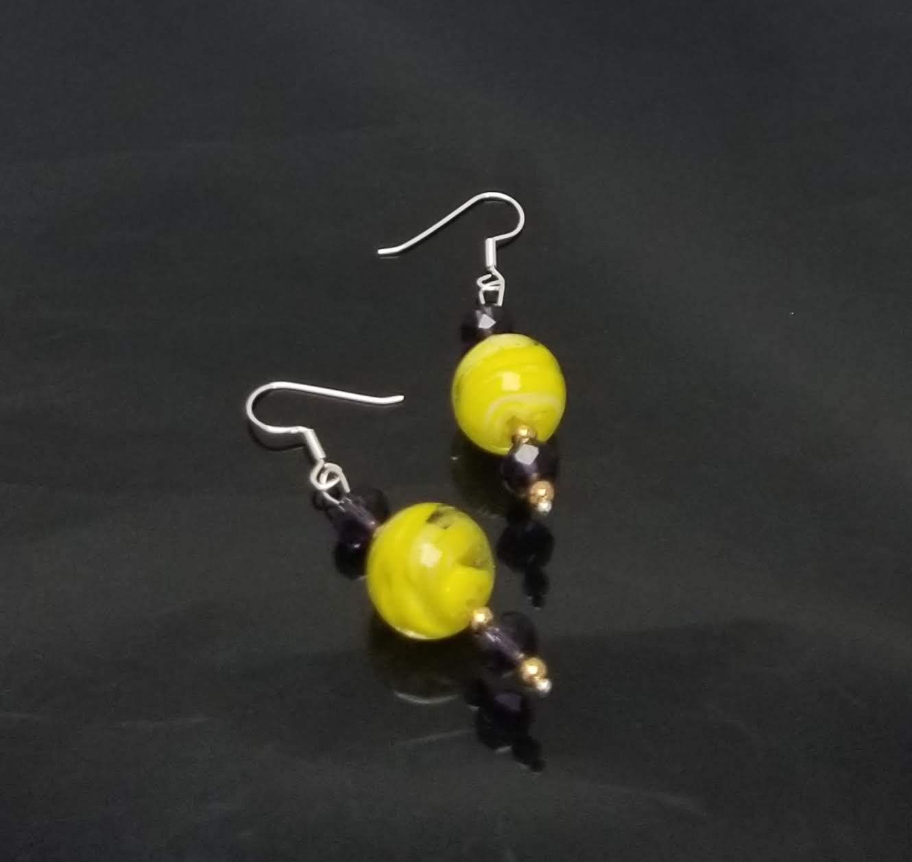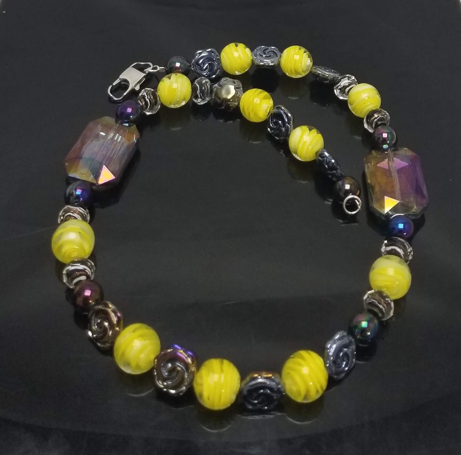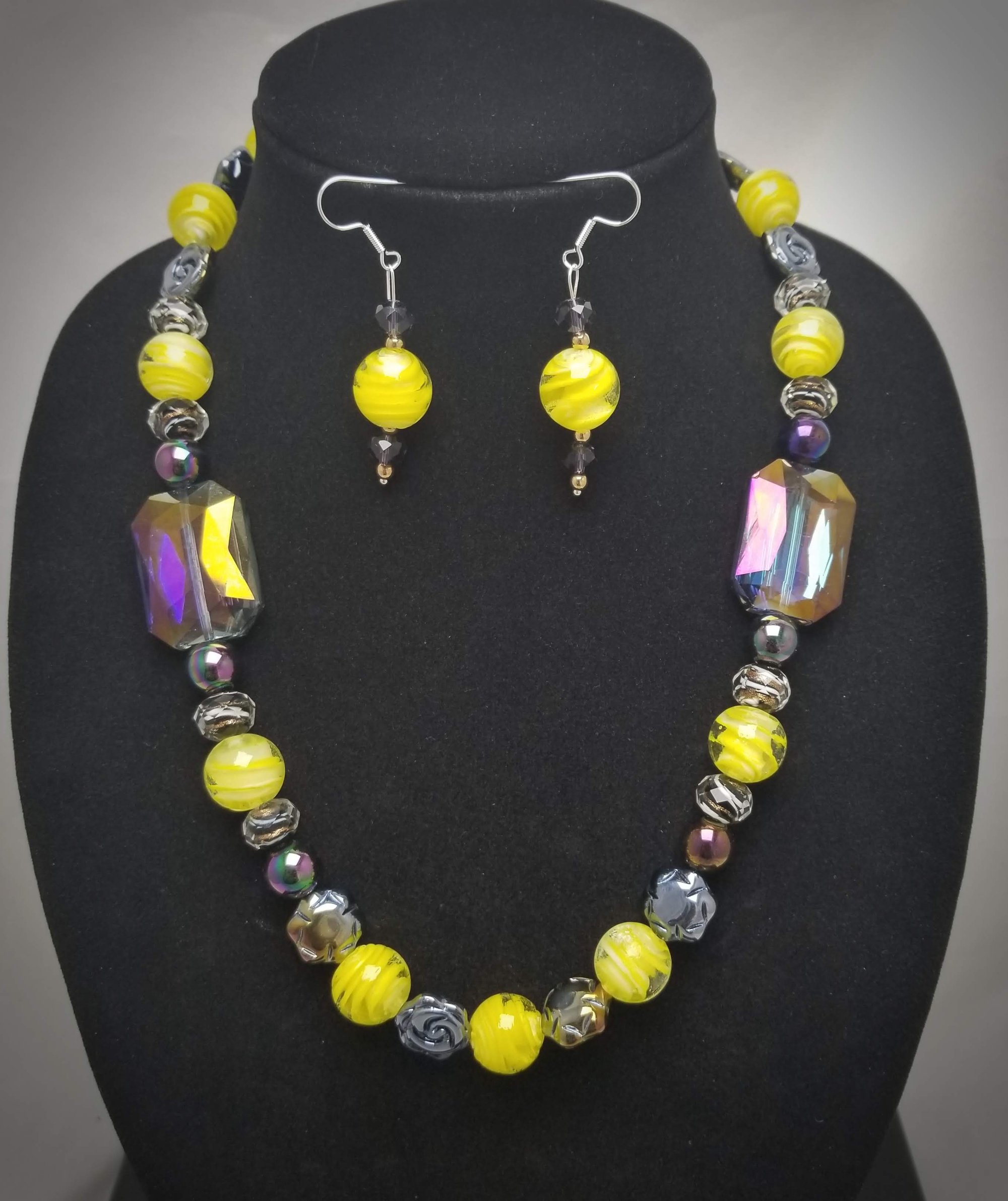 Item #811172-23 inch (set)-Vibrant glass mix paired with jumbo faceted Iridescent side accents. Jumbo silver claw clasp. Earrings on Sterling Silver hooks.
